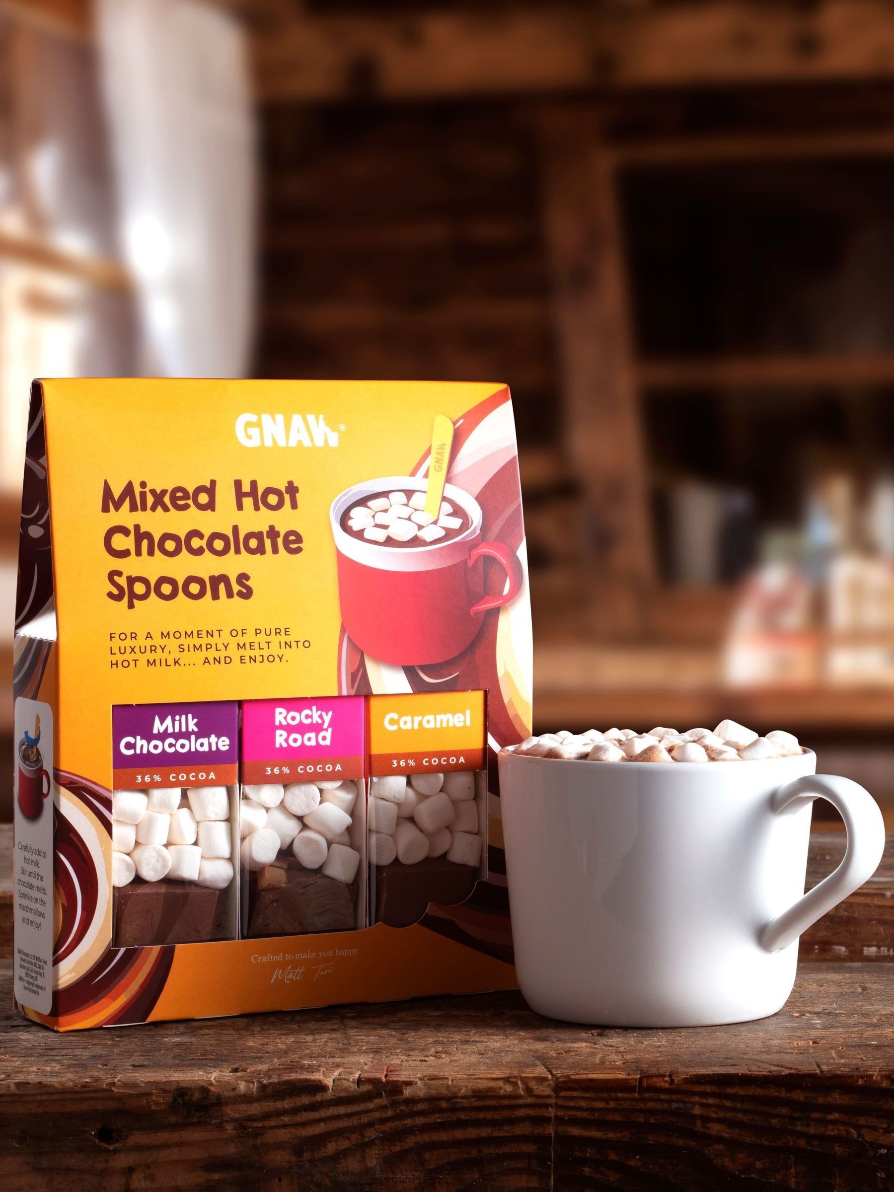 A gift set of three hot chocolate spoons, in Gnaw s three best-selling flavours; Milk, Caramel and Rocky Road. Each hot chocolate spoon comes with mini marshmallows. Simply heat up a mug of milk, place the spoon in and stir to create a luxury hot chocolate. Top with the marshmallows and enjoy!