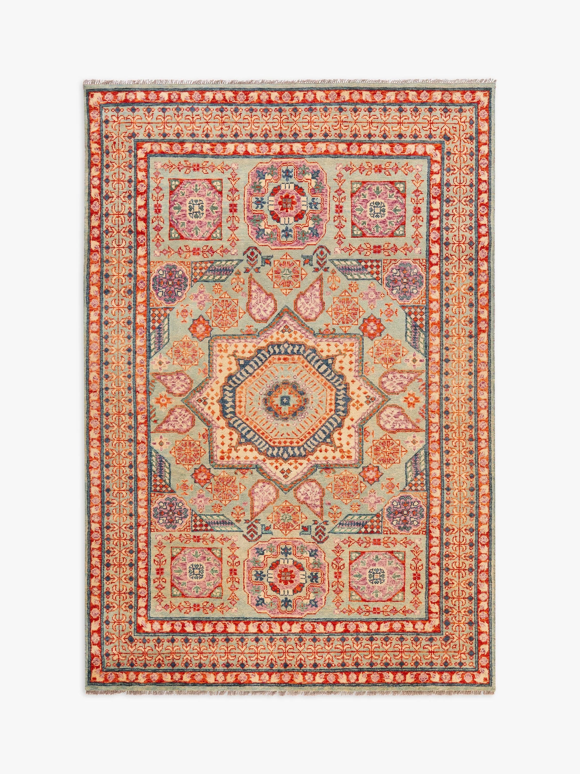 Inspired by Afghan rug design, this floor covering comes in a entrancing pattern with smart border and relaxed tasselling at either end.