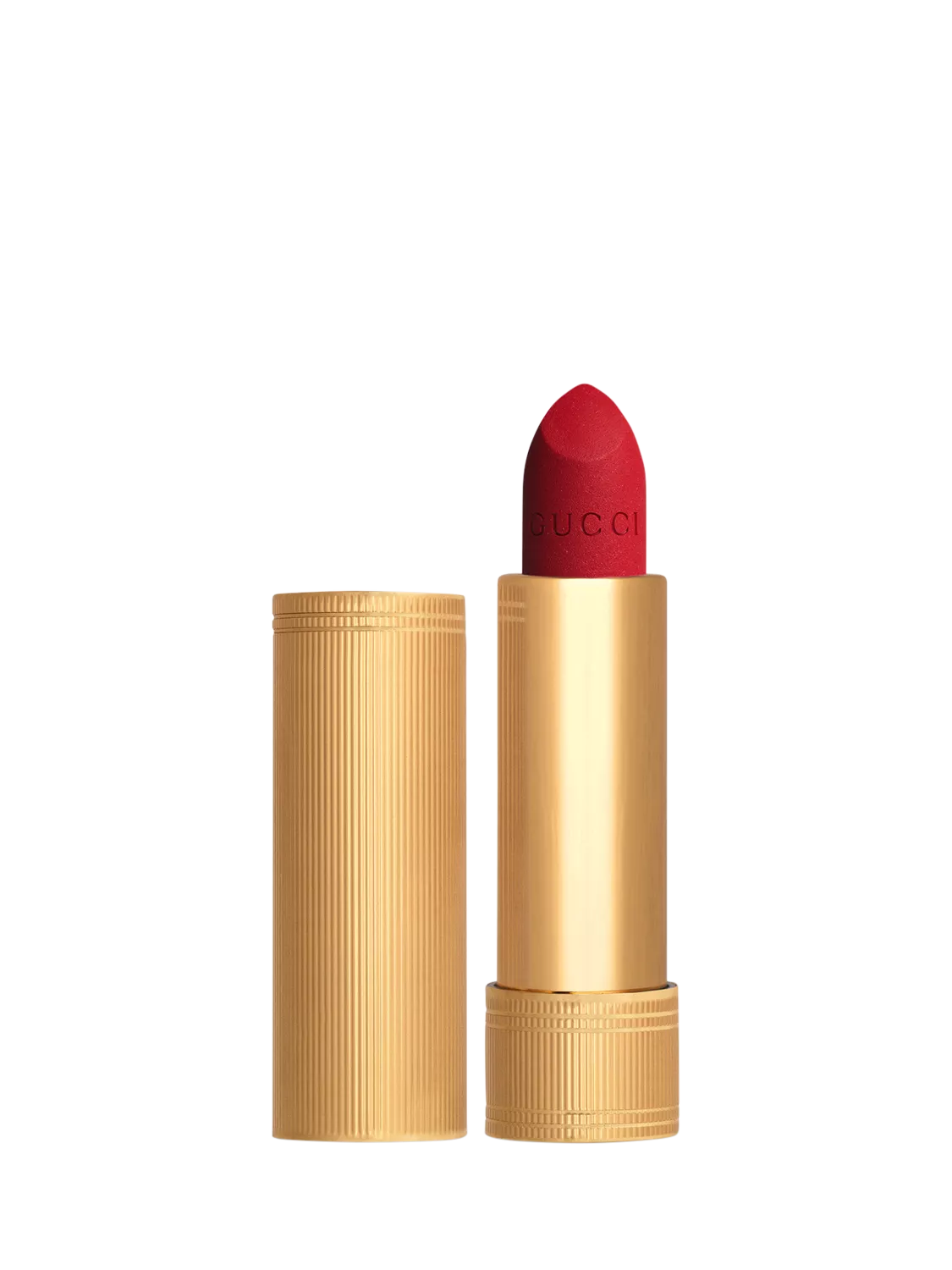 Rouge à Lèvres Matte Lipstick's gold metal hued tube reveals evenly spaced narrow ribbed grooves etched vertically into its length. Precise and elegant, the packaging recalls the era when lipstick tubes were an execution in art and decoration.