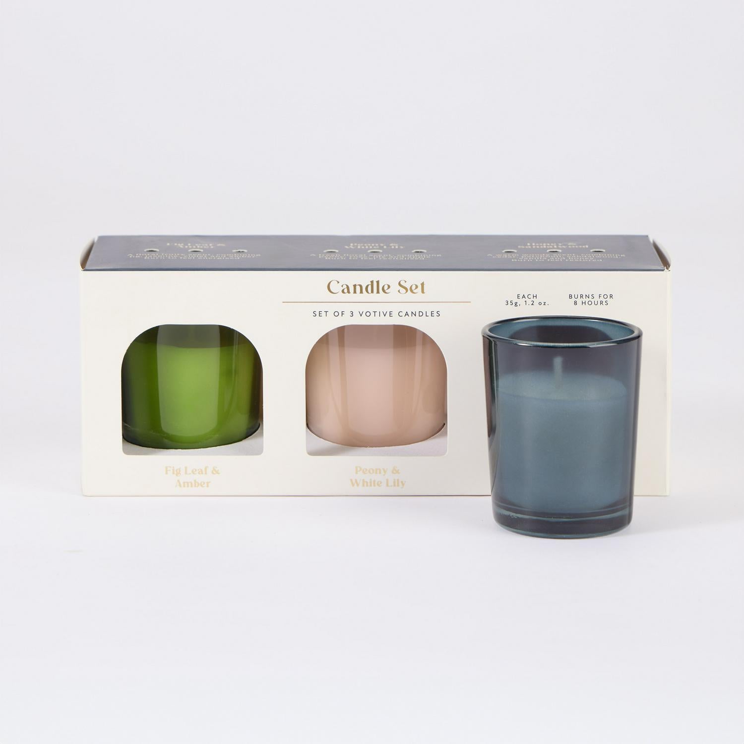 This Habitat Candle Gift Set presents a trio of votive candles housed in elegant tinted glass holders. Each candle in this set offers a distinct and appealing olfactory experience. It serves as a smart addition to your home fragrance collection or as a thoughtful present.