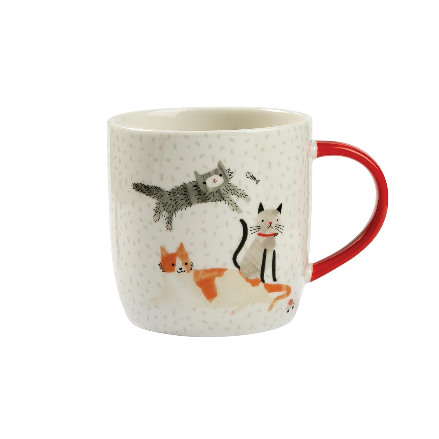 This Habitat mug is ideal for those who appreciate charming feline designs in their kitchenware. It features adorable illustrations of different kitty friends printed across a speckled white china background. A bold, hot red handle provides an eye-catching contrast to the main body of this appealing cup.