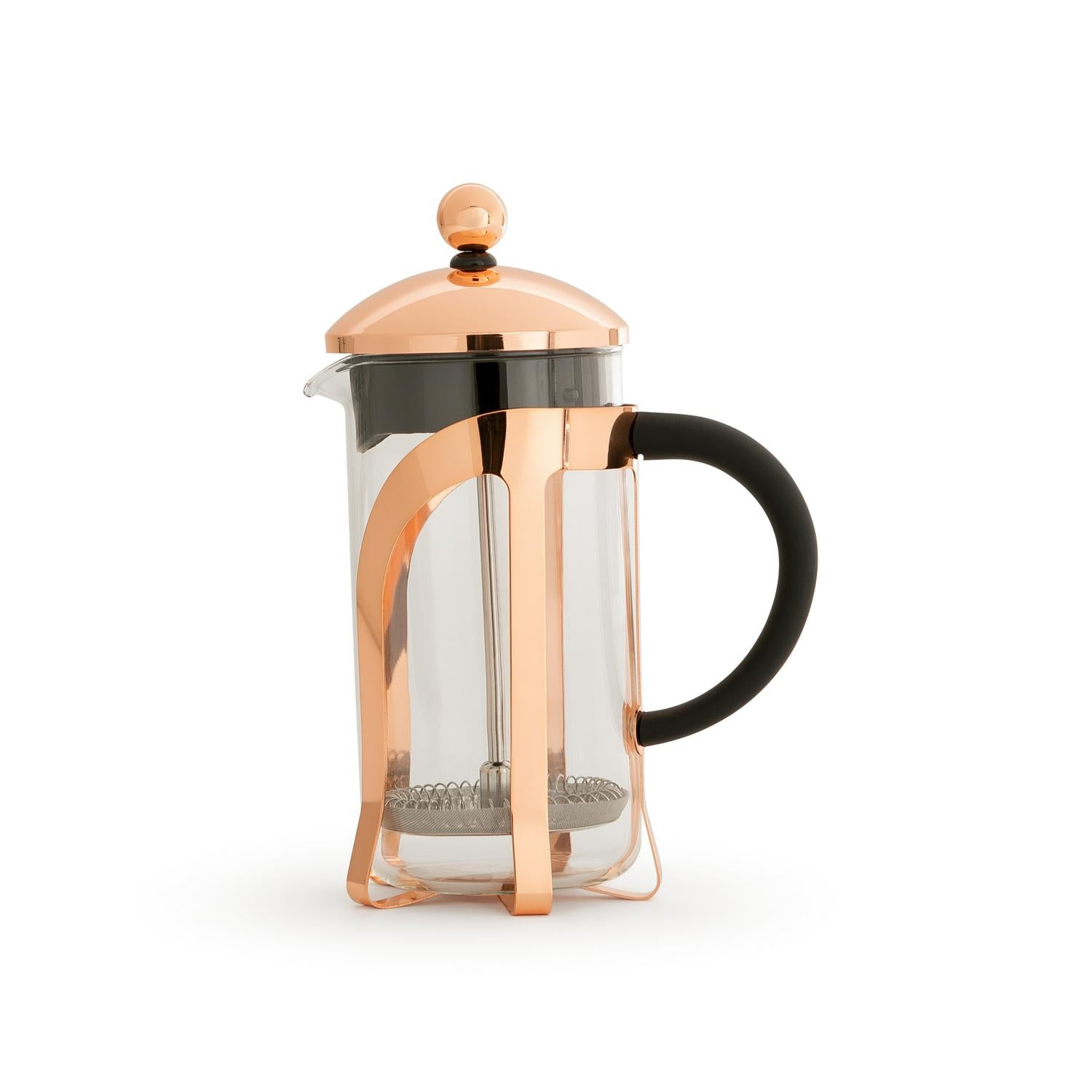 This contemporary 3 cup cafetiere showcases a modern industrial aesthetic by pairing curvaceous glass with on-trend copper accents. It is sized exactly right to keep you motivated throughout your morning routine. The design focuses on delivering both visual appeal and reliable brewing performance.