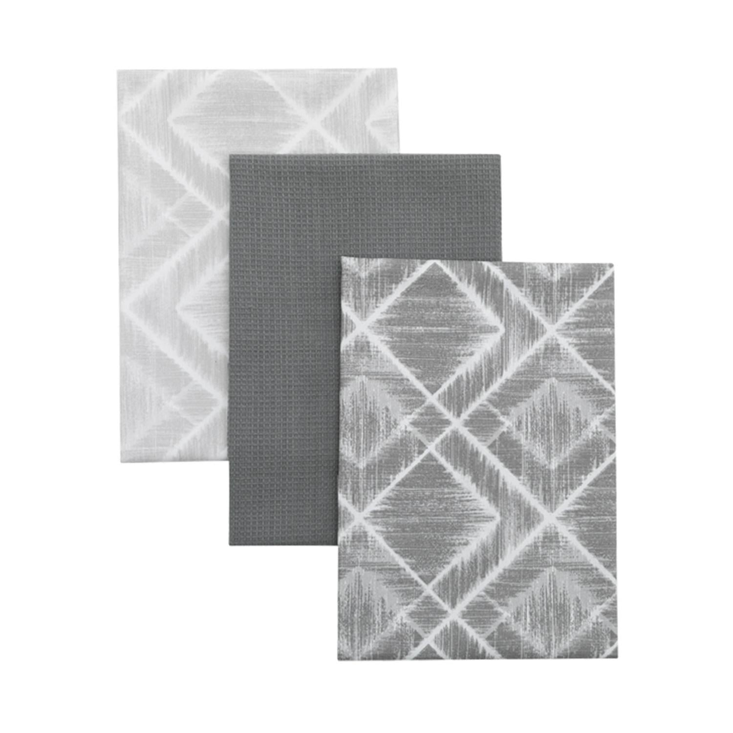 Read MoreNifty shades of grey. Our set of 3 diamond print tea towels bring a touch of glam to the kitchen. Soft and absorbent, you can dry off those dishes in high fashion. A sparkling trio.