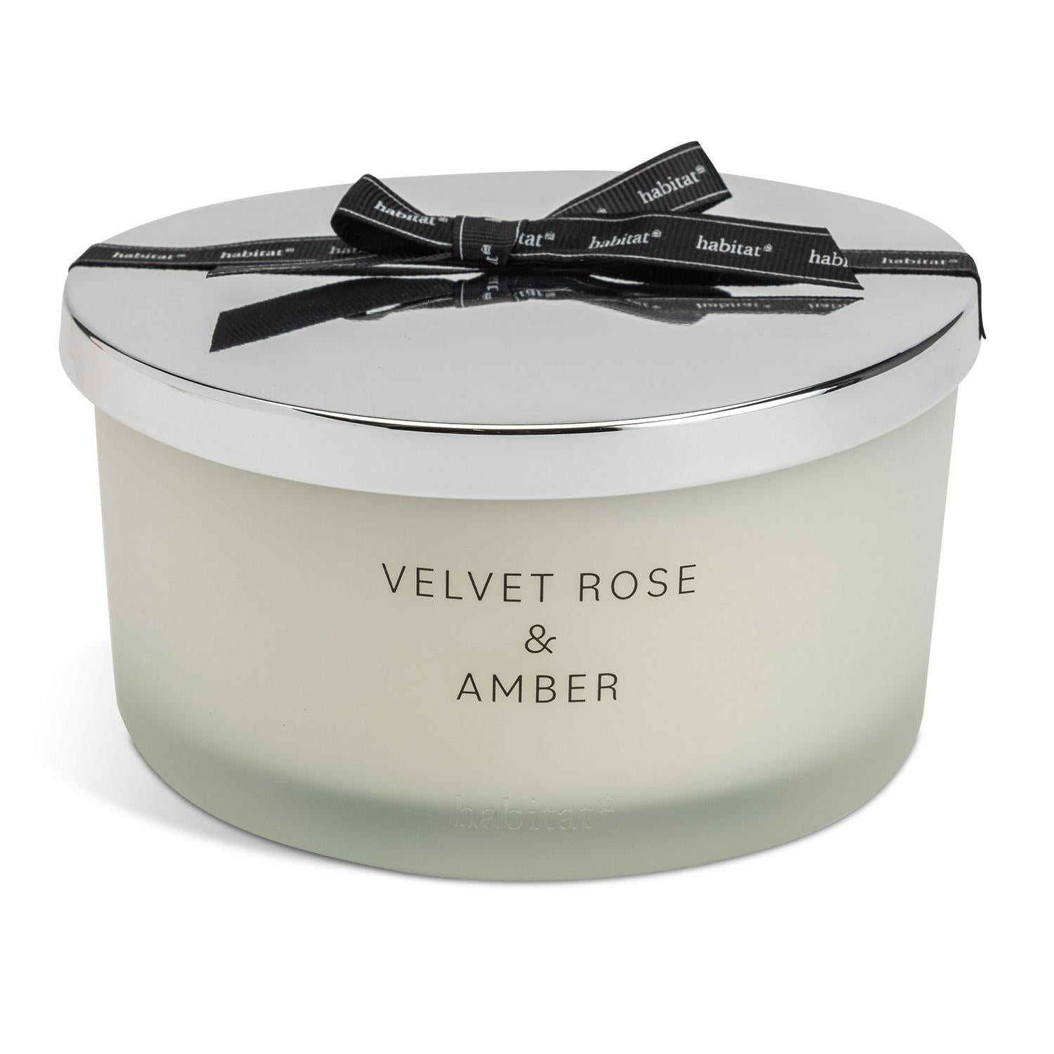 Read MoreVelvet rose and Amber, a blissful fragrance. Our lovely large luxe candle has a warm and decadently sweet aroma. Poured into a frosted glass holder and topped off with a glamorous silver lid and black bow. Habitat Luxe Velvet & Amber XL Candle with Lid.