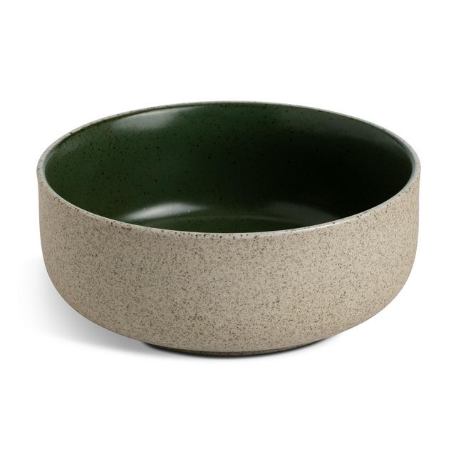 This Habitat bowl showcases modern tableware design with its distinct matte, speckled exterior finish. The contrasting deep green glaze inside provides an appealing visual texture perfect for serving breakfast or side dishes. It is designed to complement contemporary kitchen settings.