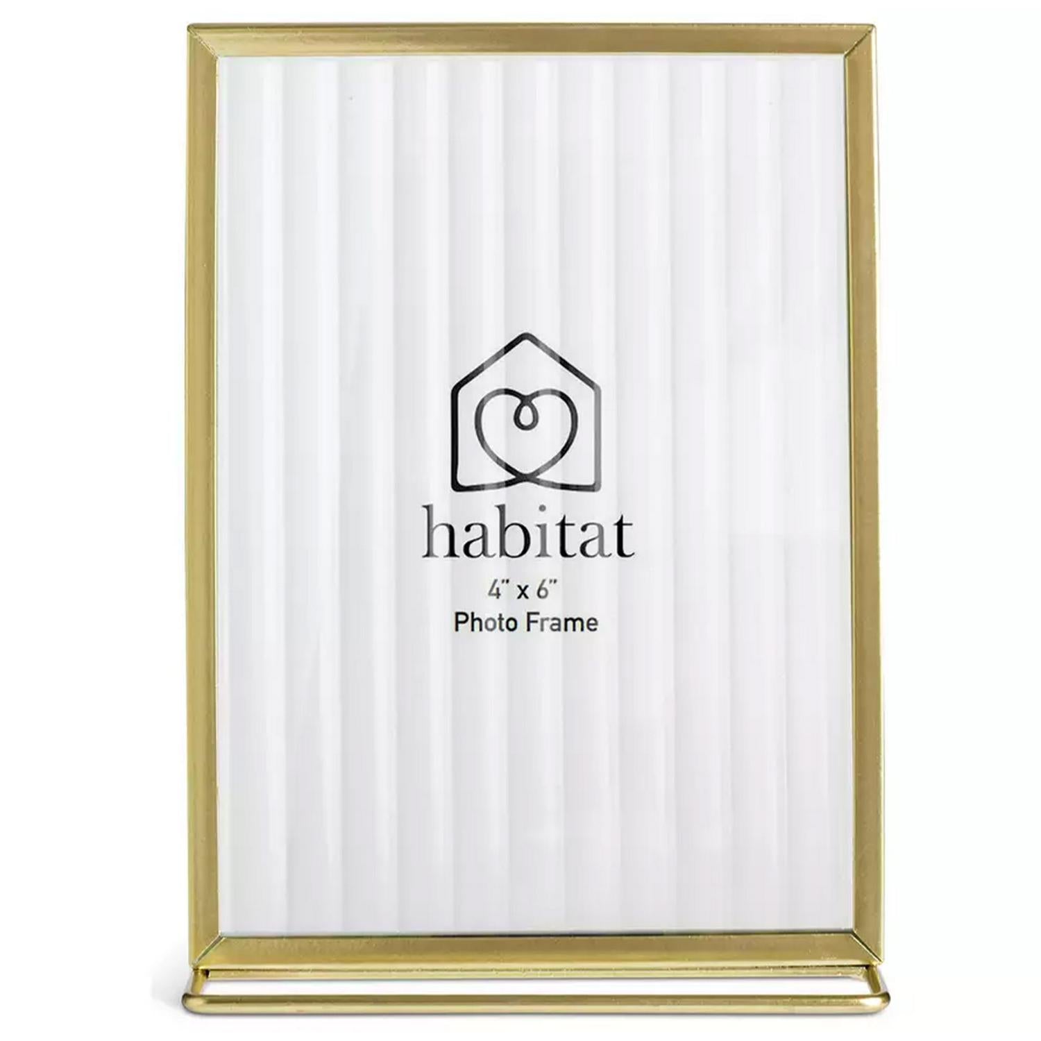 This Habitat frame combines distinctive reeded glass and golden steel components for an artistic presentation. This freestanding photo frame offers an elegant, retro aesthetic blended with modern lightness, perfectly showcasing your chosen image insert. It is built to create an immediate focal point in any room.