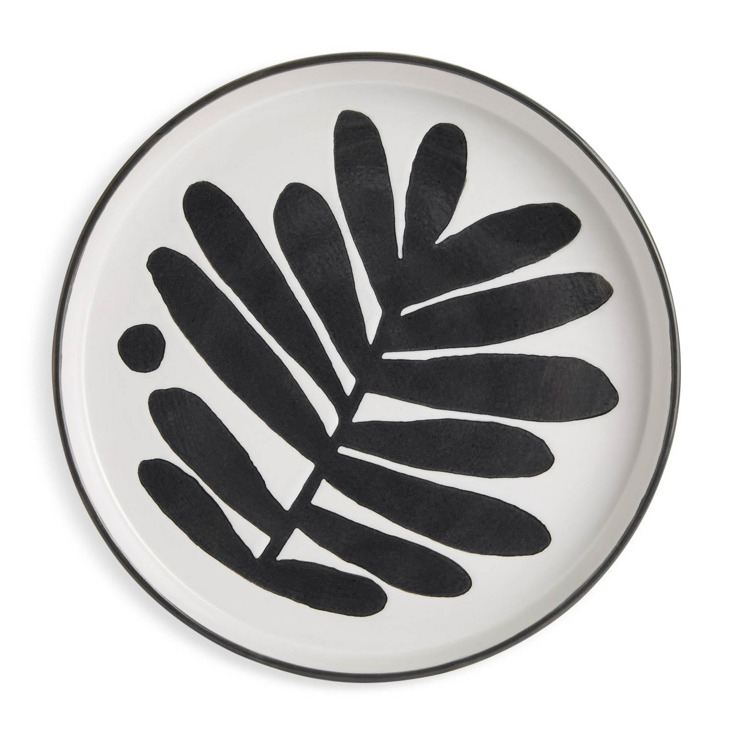 This Habitat side plate features a modern, thoroughly contemporary monochrome aesthetic. The stark black and white palette incorporates a bold leaf pattern, nodding towards modern Scandi design principles. Crafted entirely from durable stoneware, this piece transitions well between different uses.