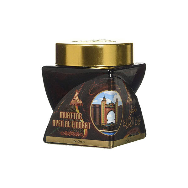 MUATTAR Ayen Al Emarat is a distinctive 24gm concentrated fragrance presented in an ornate glass vessel. This product carries a premium aesthetic, highlighted by its unique bottle design and prominent gold-toned cap. It is designed to deliver a rich aromatic experience consistent with traditional Middle Eastern perfumery.