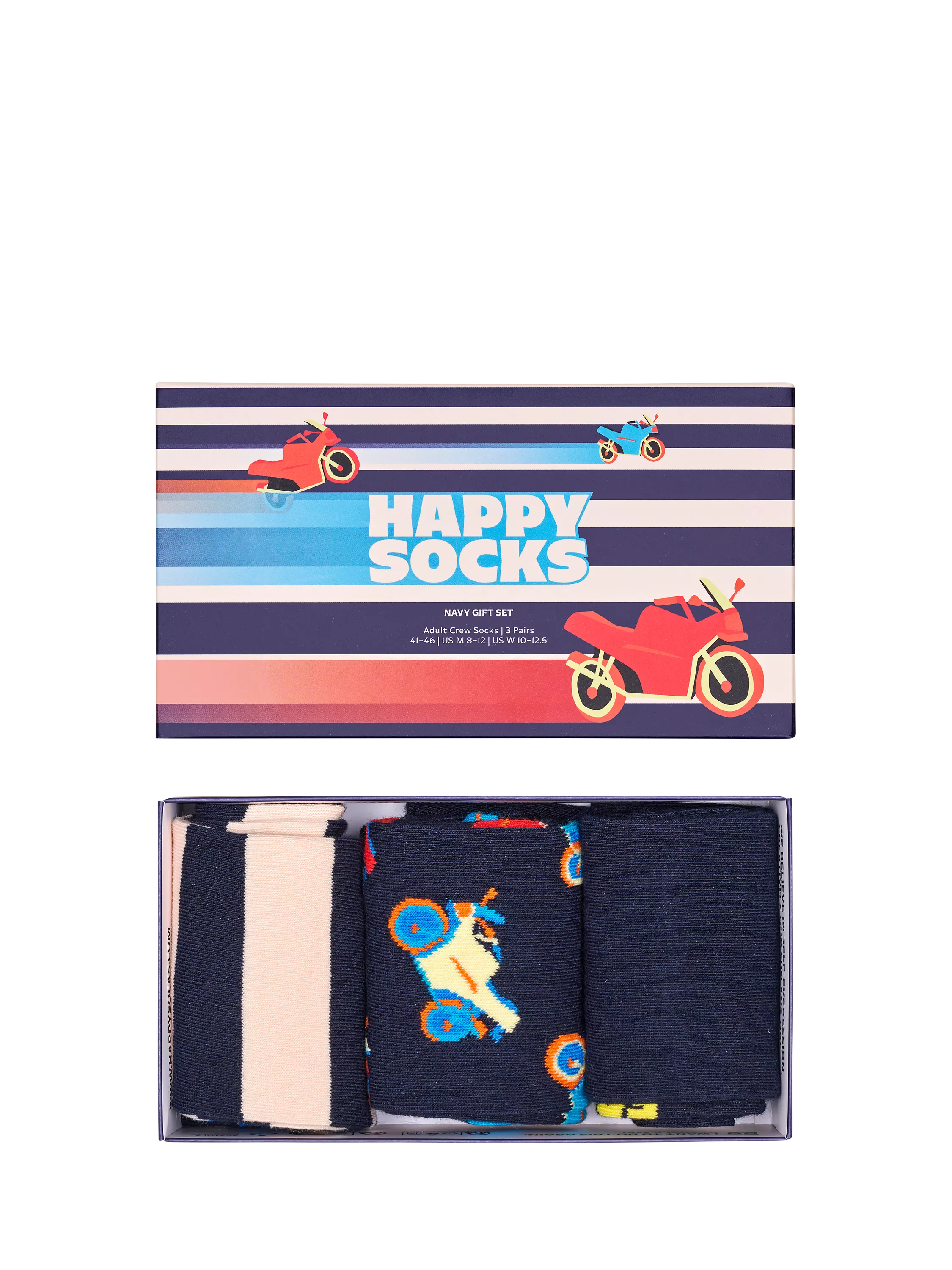 Happy Socks cheer up your feet! Climb onto your bike and take a drive down the highway with these socks, that perfect shade of blue. This gift set comes with three pairs of deep blue socks, one solid, another with stripes and the last one with motorcycles on it!