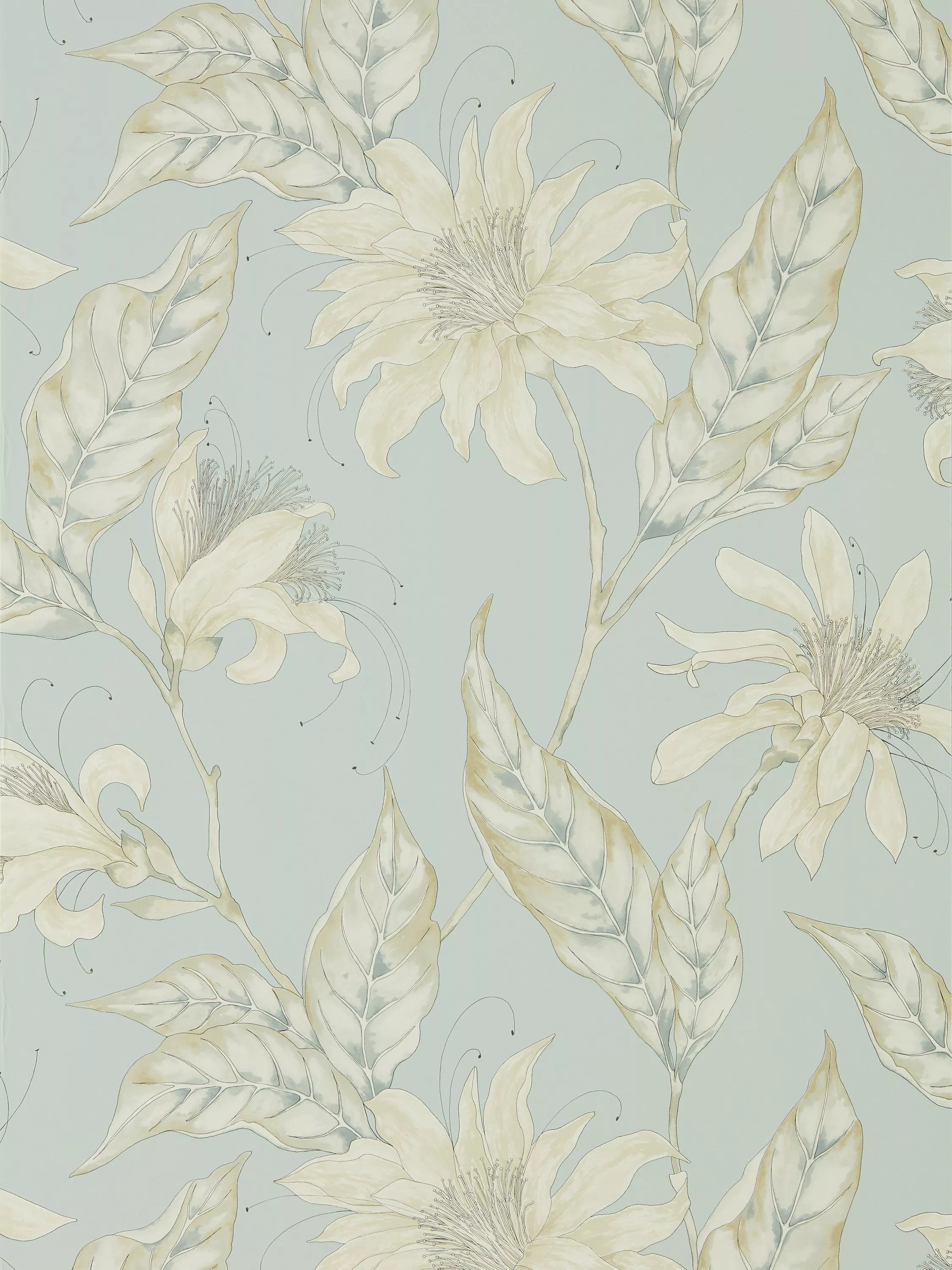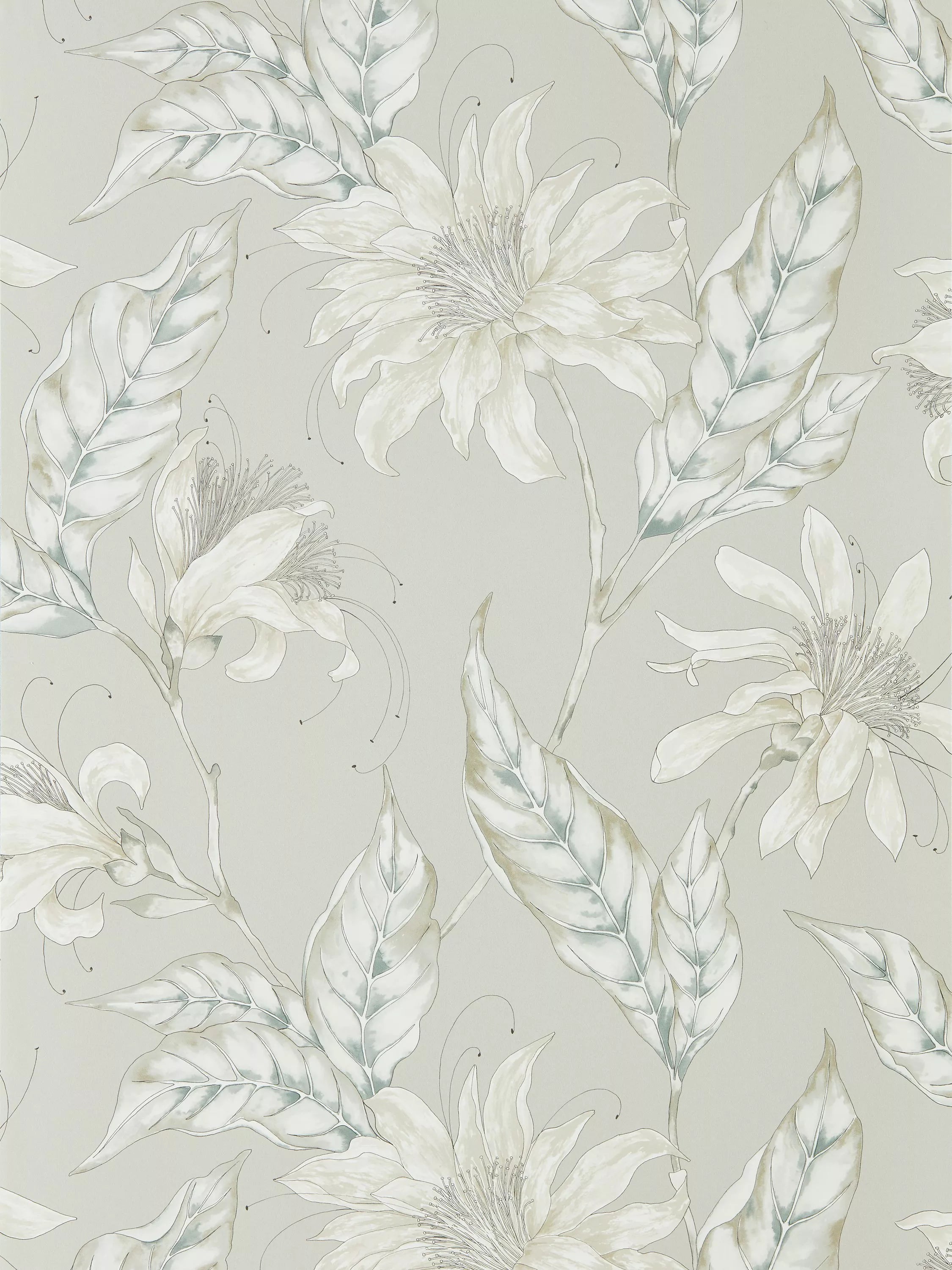 Hand drawn in pen and watercolour, this beautiful contemporary wallpaper is adorned with stylised tropical flowers. With its delicate painterly look and soft colour palette, intricate linework adds detail to this elegant design.