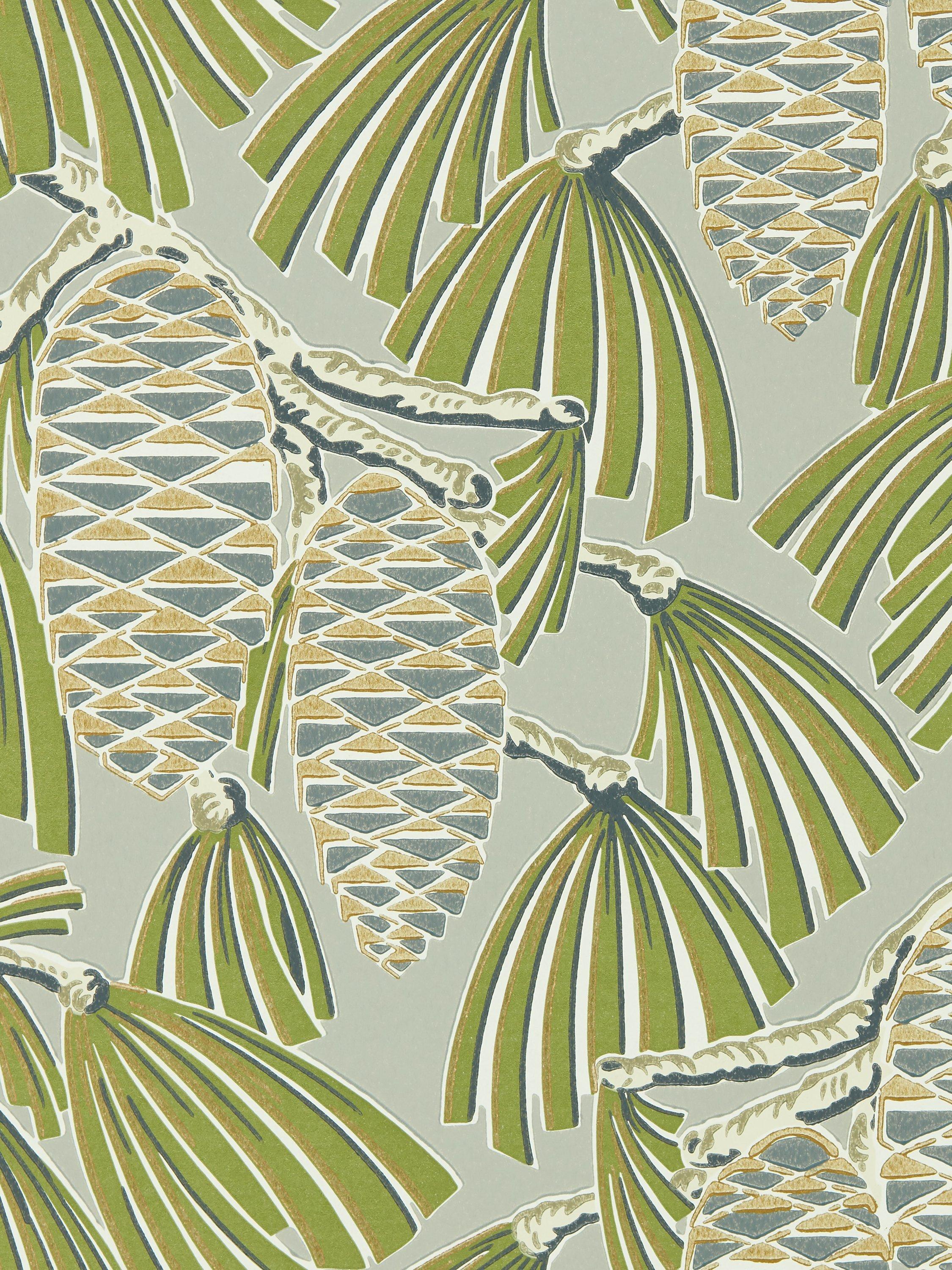 Harlequin Foxley Wallpaper presents sophisticated natural beauty for contemporary interiors now. This exquisite wall covering successfully showcases softly coloured pine cones and highly stylised leaves. These key elements are visually enriched with distinct metallic highlights, creating a truly beautiful depth and an elegant layered decorative finish for your main living area.