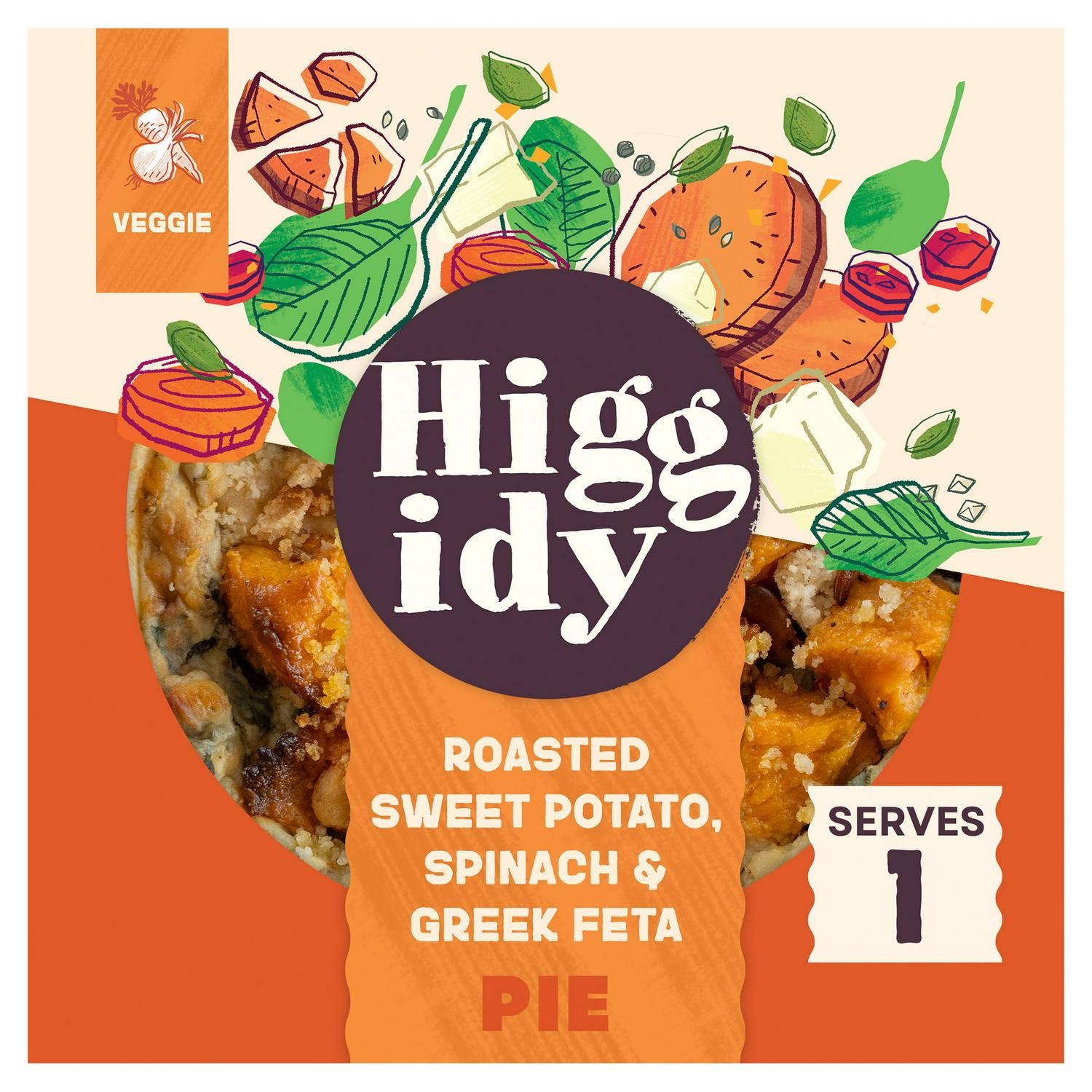 This Higgidy pie combines aromatic roasted sweet potato, fresh spinach, and tangy Greek feta cheese for a rich flavour profile. It is baked in a classic all-butter shortcrust pastry base, creating a satisfying vegetarian meal. The Vegetarian Society approves this filling, confirming its suitability for vegetarian diets.