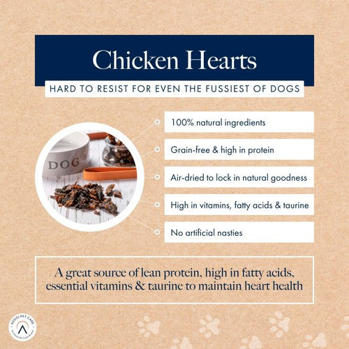Hollings offers these 100% natural chicken hearts as a delicious reward for your dog. The hearts are air-dried carefully to lock in all the natural goodness, ensuring a highly appealing treat. They are an excellent source of lean protein to support muscle maintenance and overall vitality.