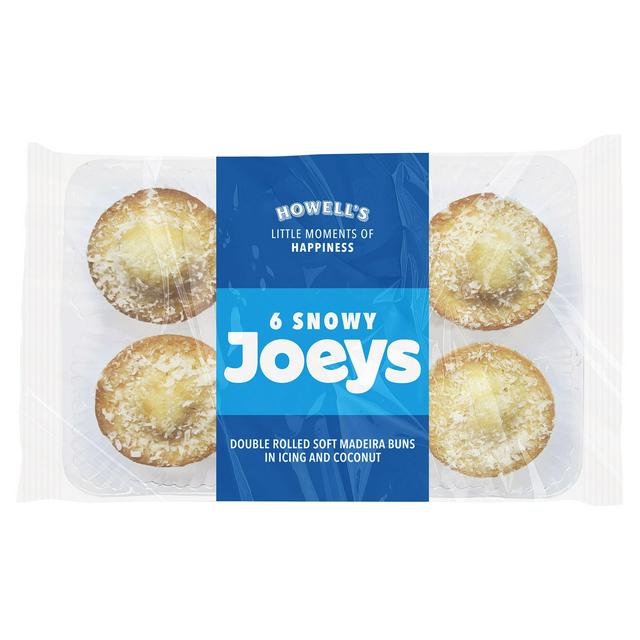 Howells Snowy Joeys consist of six classic Madeira buns perfect for an everyday delight. Each bun is rolled in a layer of soft white icing and fully coated with desiccated coconut. They provide a familiar, comforting texture and flavour profile suitable for enjoying with tea.