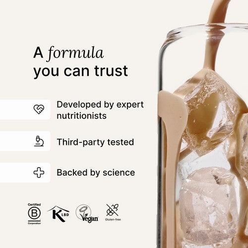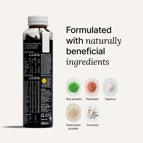 Water, Pea Protein, Faba Bean Protein, Tapioca Starch, Cold-Pressed Rapeseed Oil, Coconut Milk Powder, Ground Flaxseed, Coconut Sugar, Natural Flavourings, Soluble Vegetable Fibre (Chicory, Corn), Micronutrient Blend (Minerals (Potassium, Chloride, Calcium, Magnesium, Phosphorus, Copper, Zinc, lodine, Chromium), Vitamins (C, K, E, A, Niacin, D, B12, Pantothenic Acid, Biotin, B6, B2, B1, Folate), Choline), Flaxseed Oil Powder, Cocoa Powder (0.5%), Medium-Chain Triglyceride Powder (from Coconut), Green Tea Extract, Sweetener: Enzymatically produced Steviol Glycosides, Steviol Glycosides from Stevia, Thickener: Gellan Gum
