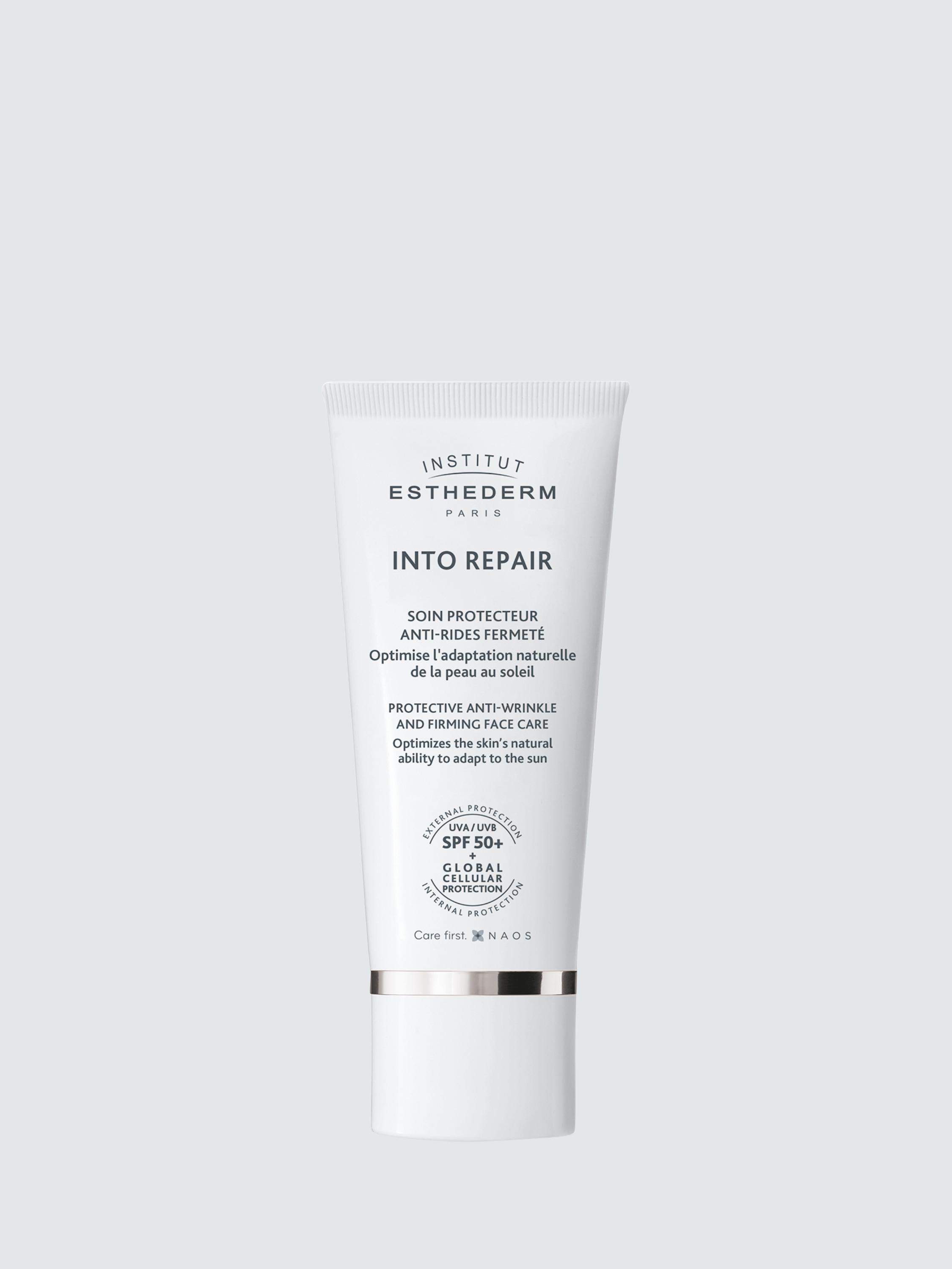 Institut Esthederm Into Repair is a protective anti-wrinkle face cream providing high SPF 50+ defence. This 50ml daily treatment shields sensitive skin against UVA, UVB, blue light, and infrared rays. It is specially formulated to increase sun tolerance while preventing oxidative stress and visible cellular damage for everyone.