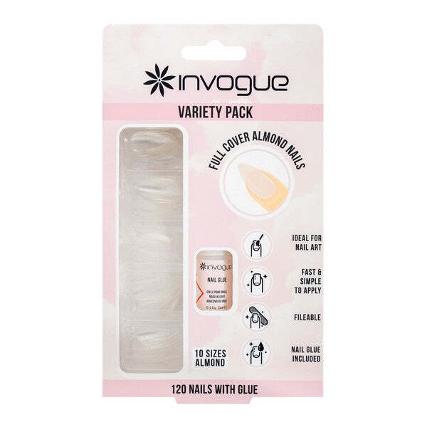 the possibilities are endless with invogue full cover nails stunningly shaped in an almond design the clear nails are a great canvas for nail art so you can design your nails your own way whether you are decorating with nail polish or nail art the false nails allow the design to last for longer due to the lack of moisture on the nail compared to natural nails contains our three second nail glue peta approved crueltyfree vegan friendly how to use prep and clean nails with nail dehydrator or an acetone polish remover lay out false nails in the order that you will be applying them swirl a small amount of glue onto your real nail and the false nail carefully place the false nail directly over your real nail so that the bottom curve lines up with your cuticle press down gently and hold for 3 seconds until set repeat with the remaining nails