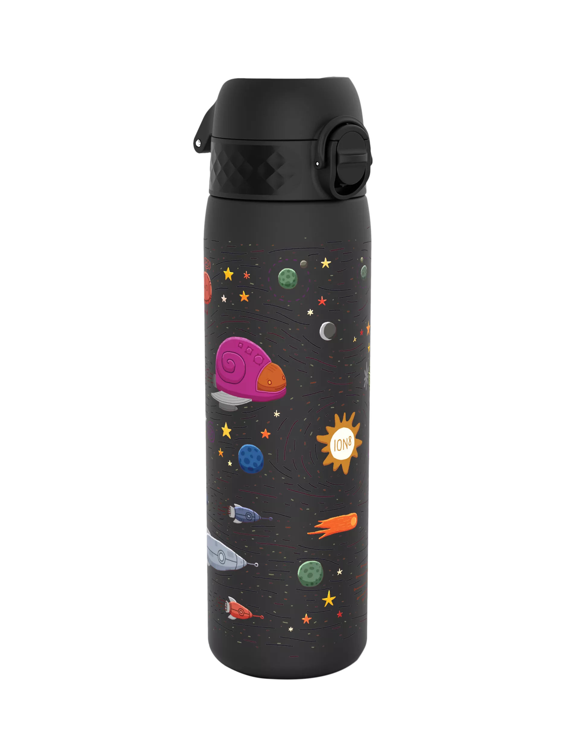 Slim and leak-proof, this fun space-print drinks bottle from Ion8 easily fits in a bag to take with you on your travels for hydration on the go. It fits into all car cup holders and pockets on kid and adult backpacks. When closed, the spout and vent are completely sealed to prevent leaks.