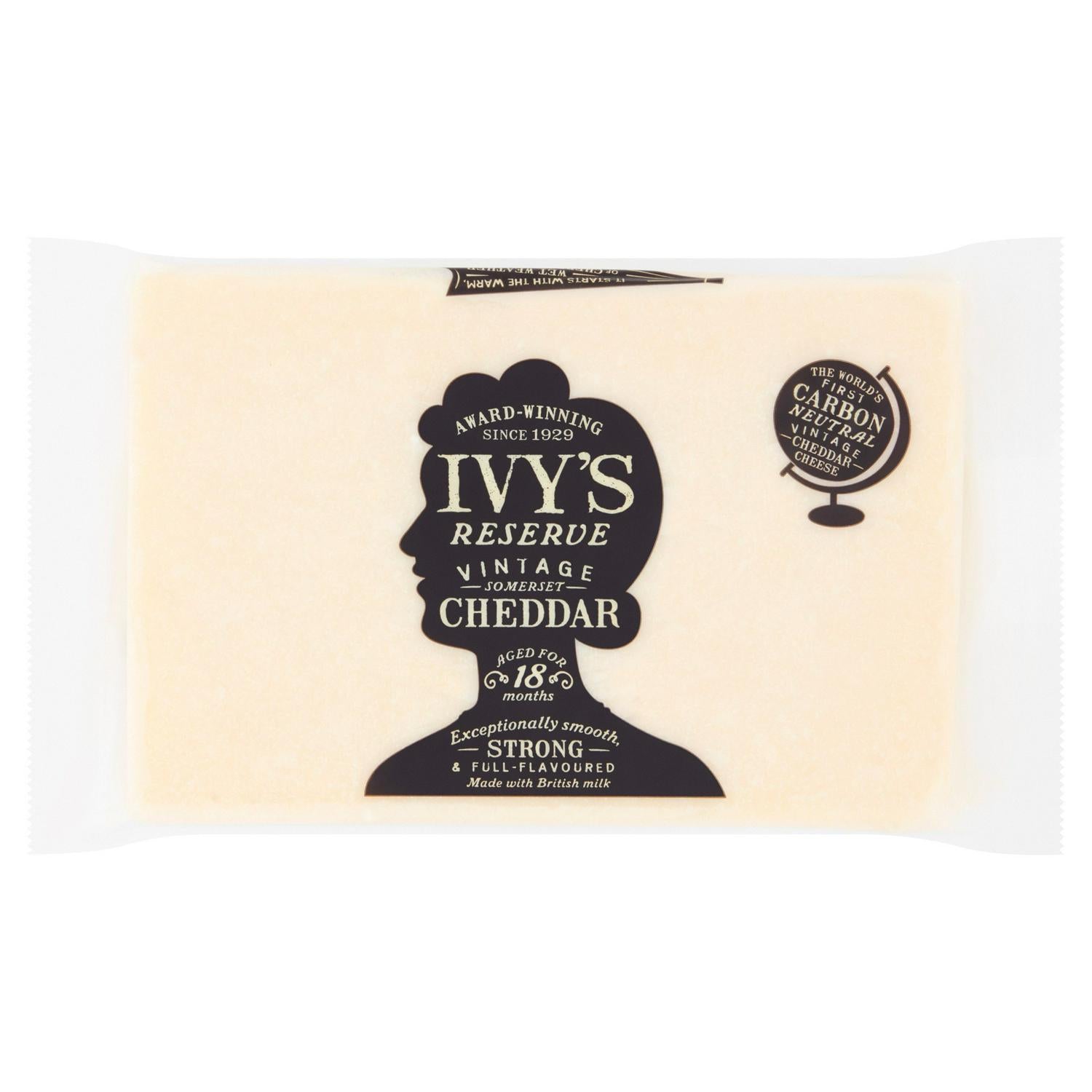 This Ivy's Reserve Cheddar is a specially selected cheese aged for 18 months under wood, resulting in a rich flavour profile. It is an award-winning cheese with a tradition dating back to 1929. Enjoy the complex notes that only extended maturation can provide in this exceptional product.
