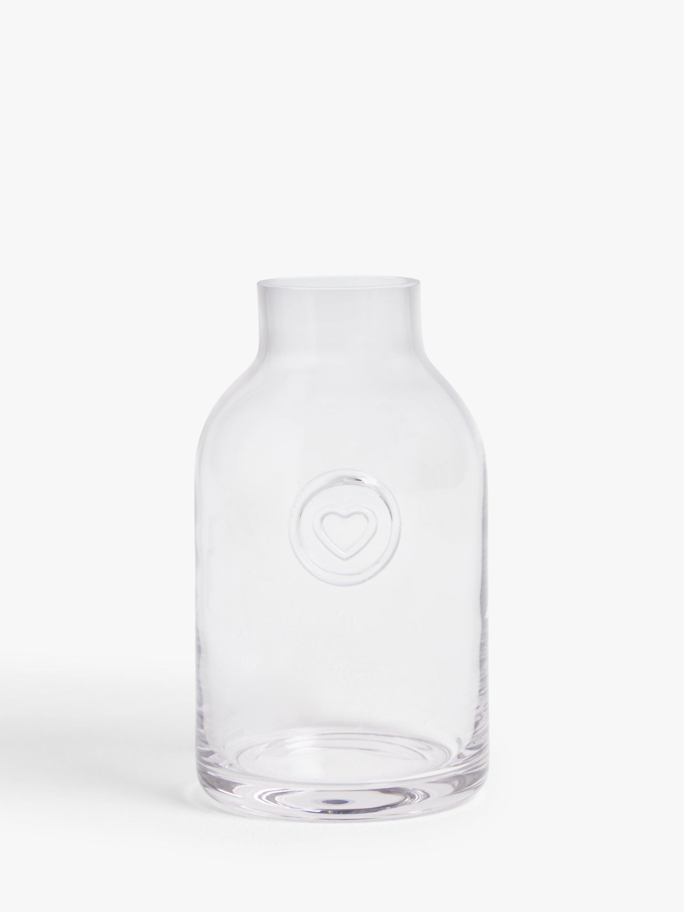 This John Lewis Jam Jar Vase stands 18cm tall, ideal for small bouquets or cuttings. It is crafted from clear, hand-blown glass, ensuring a unique finish for any space. Its decorative design includes a sweet heart seal detail visible on the surface. This excellent piece elevates home aesthetics effortlessly.