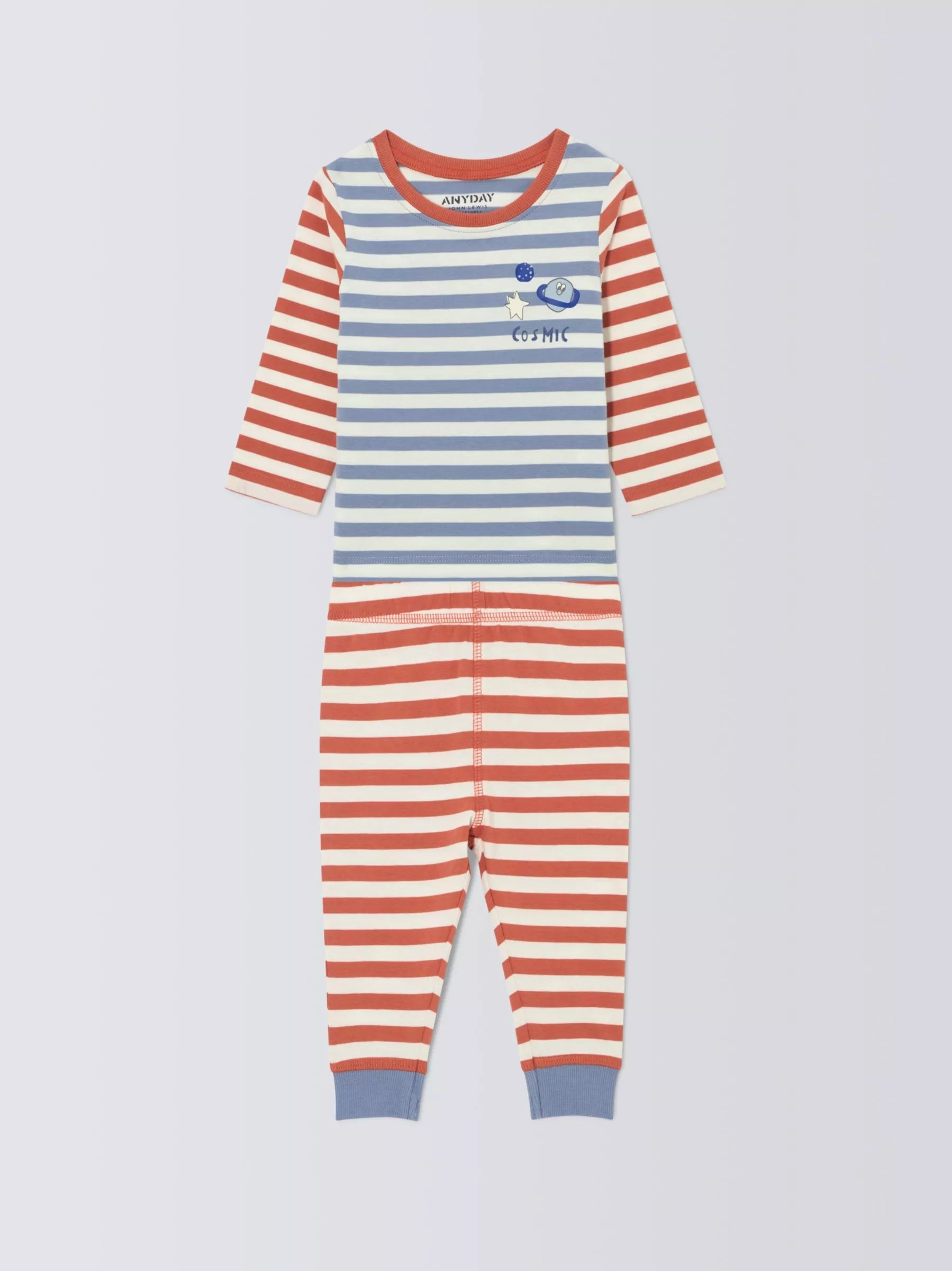 Dress your little one in adorable comfort with these John Lewis ANYDAY Baby Cosmic Striped Pyjamas. Made from soft, breathable 100% cotton, these pyjamas are perfect for sensitive skin. Better Cotton Initiative supports sustainable cotton farming.