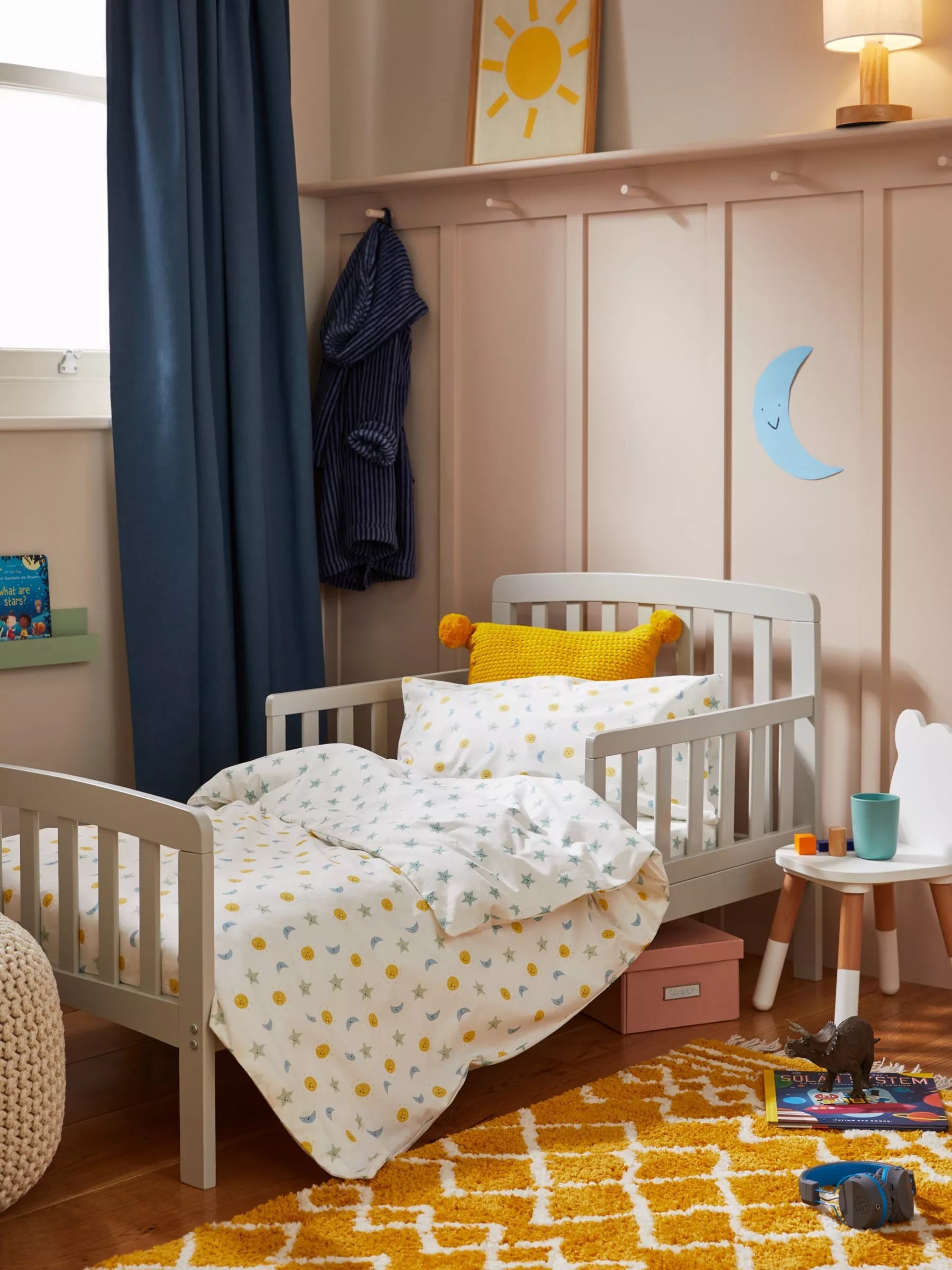 Suitable from 18 months, this toddler bed requires a standard 140 x 70cm mattress (sold separately). The bed complies with safety standards EN 8509:2008+A1:2011.