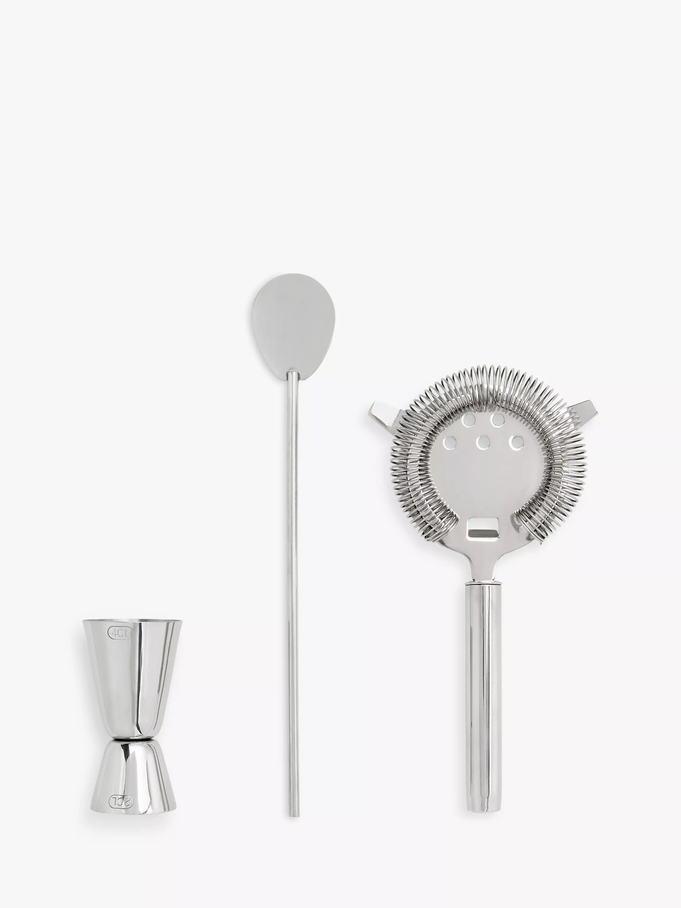 Classic barware set for making cocktails at home. Made of durable stainless steel, this set includes a stirrer, strainer and double jigger.
