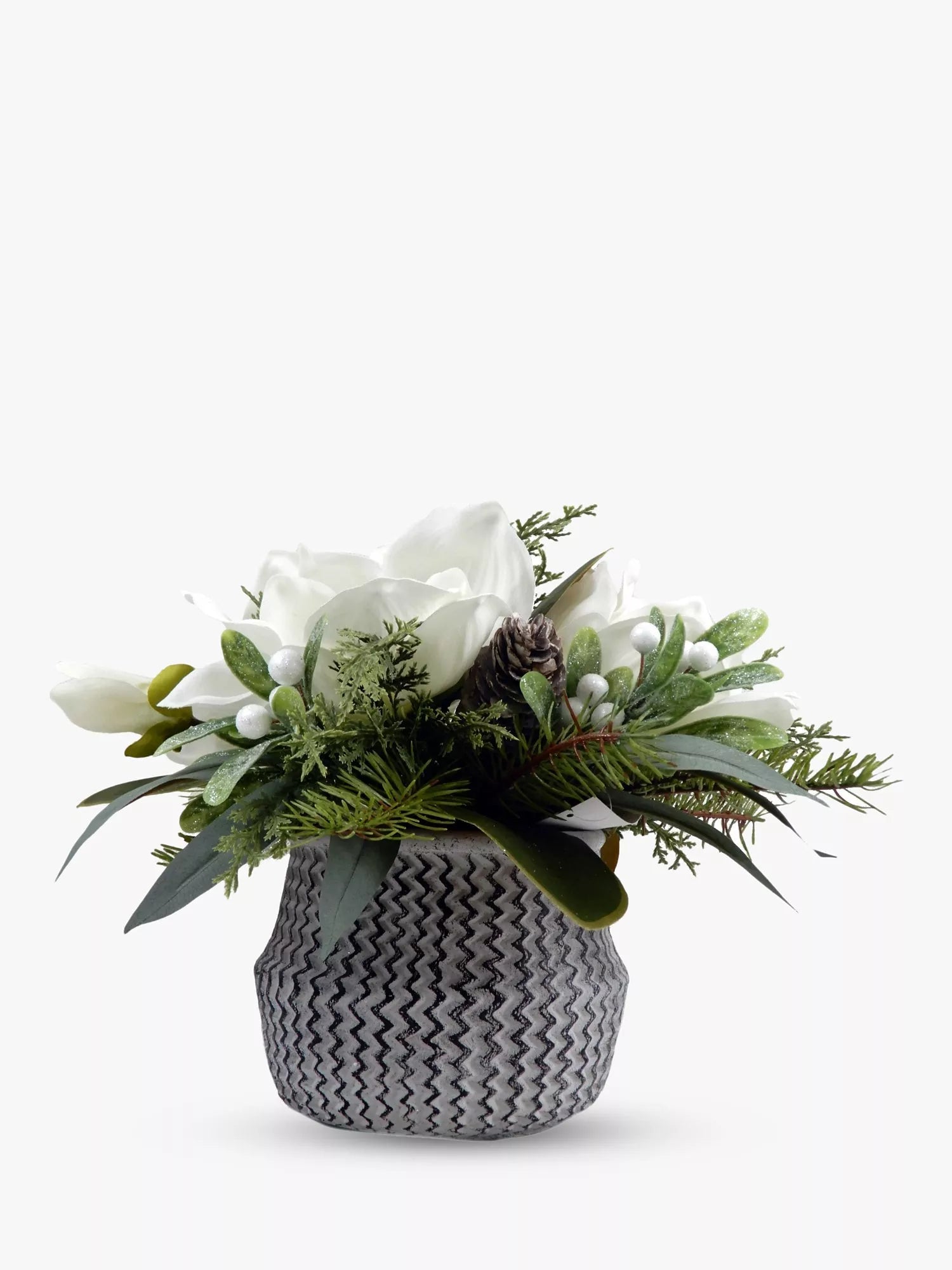 A stunning centrepiece that you can bring out again and again or leave on display, our Artificial Magnolias with Pinecones come in a cement pot with textured, zig-zag design for added interest.