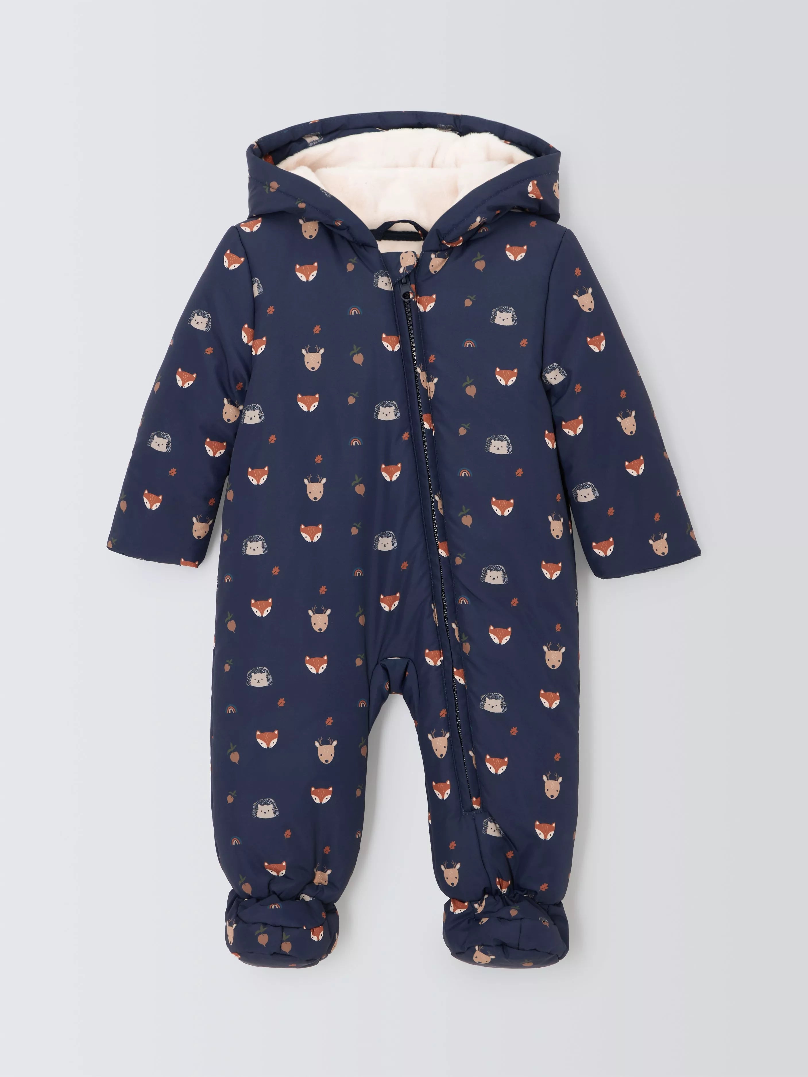 This shower-resistant snowsuit with an all-over animal face print is great for keeping your little one warm with its fleece-lined design. It also benefits from integrated foldover mittens to keep little fingers toasty without the worry of losing them. The zip-through front helps with easy on and offs.