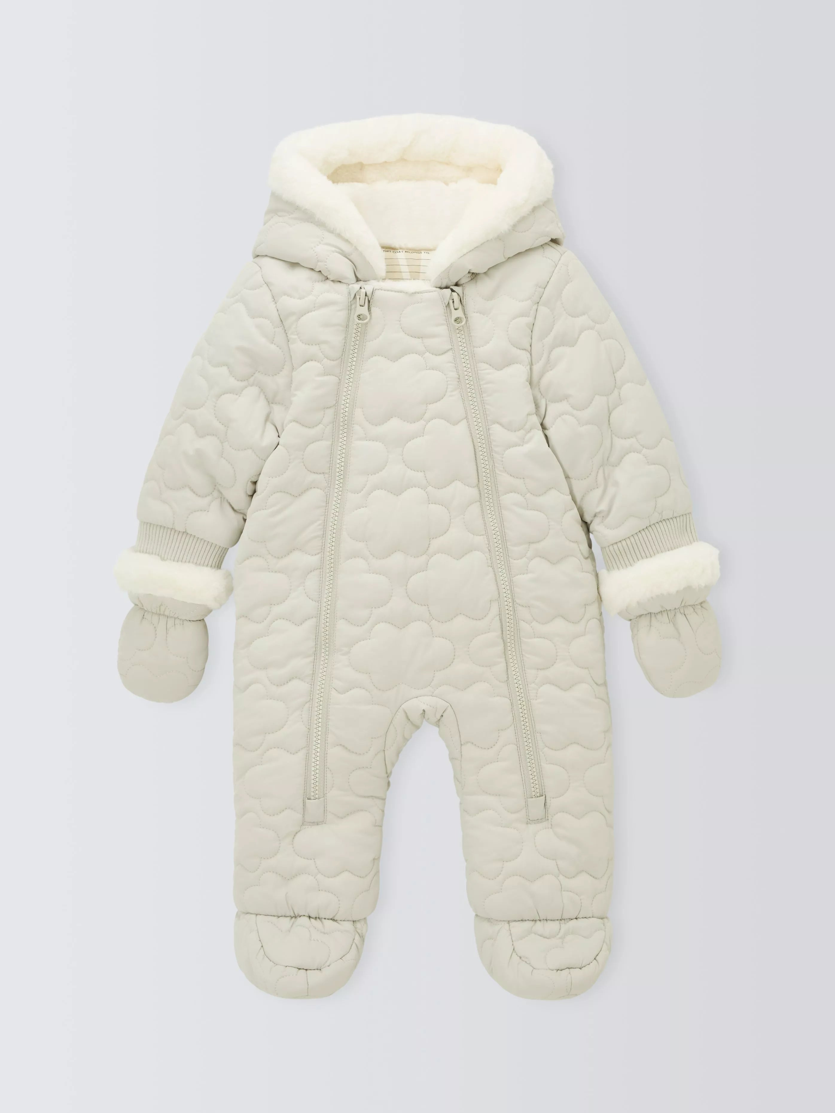 Baby snowsuit with all over could-shaped quilted design. Featuring a 2 zip opening and faux fur lining and hood trim.