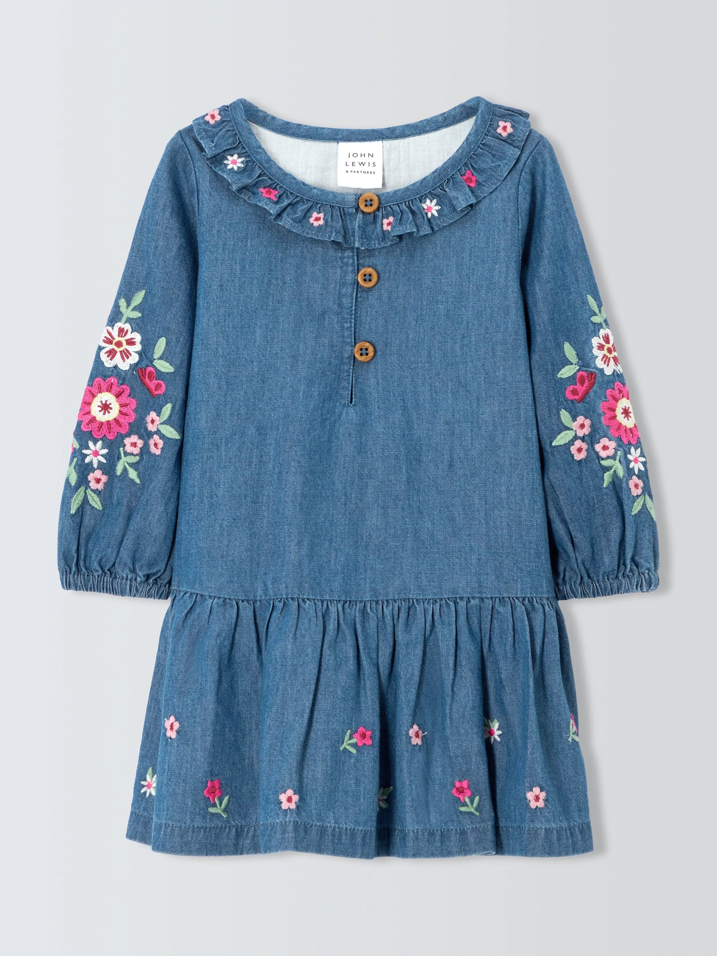 This style elevates the classic denim dress with pretty floral embroidery. The button-down placket to the front helps with dressing while the ribbed cuffs ensure a great fit.