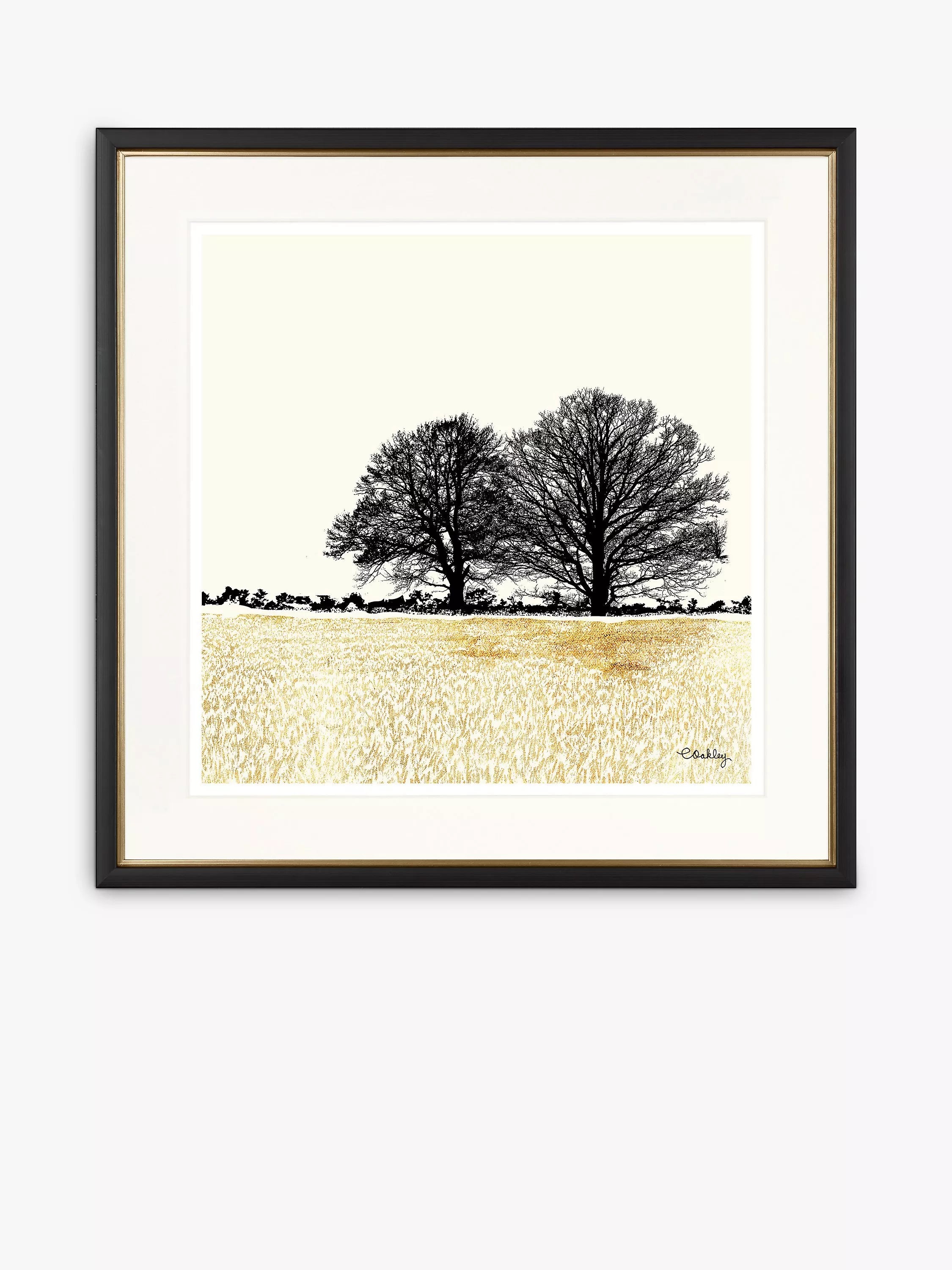 A pair of trees in silhouette stand against a neutral horizon on this work by artist Charlotte Oakley. Gold foil embellishments are subtly matched on the inner edge of the mounted picture frame.