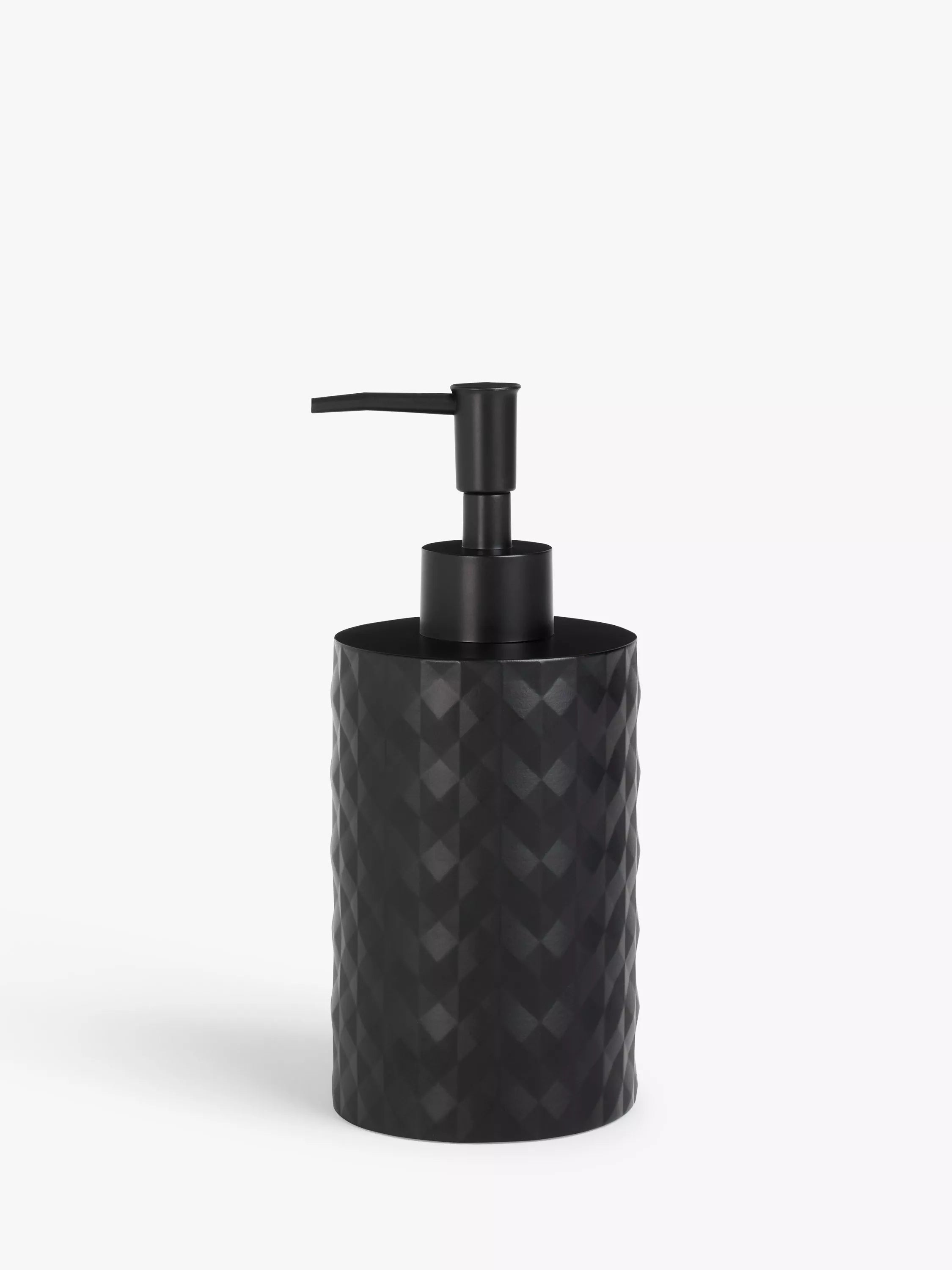 This polyresin soap dispenser has a textured diamond design that subtly reflects the light for a sleek and modern bathroom look.