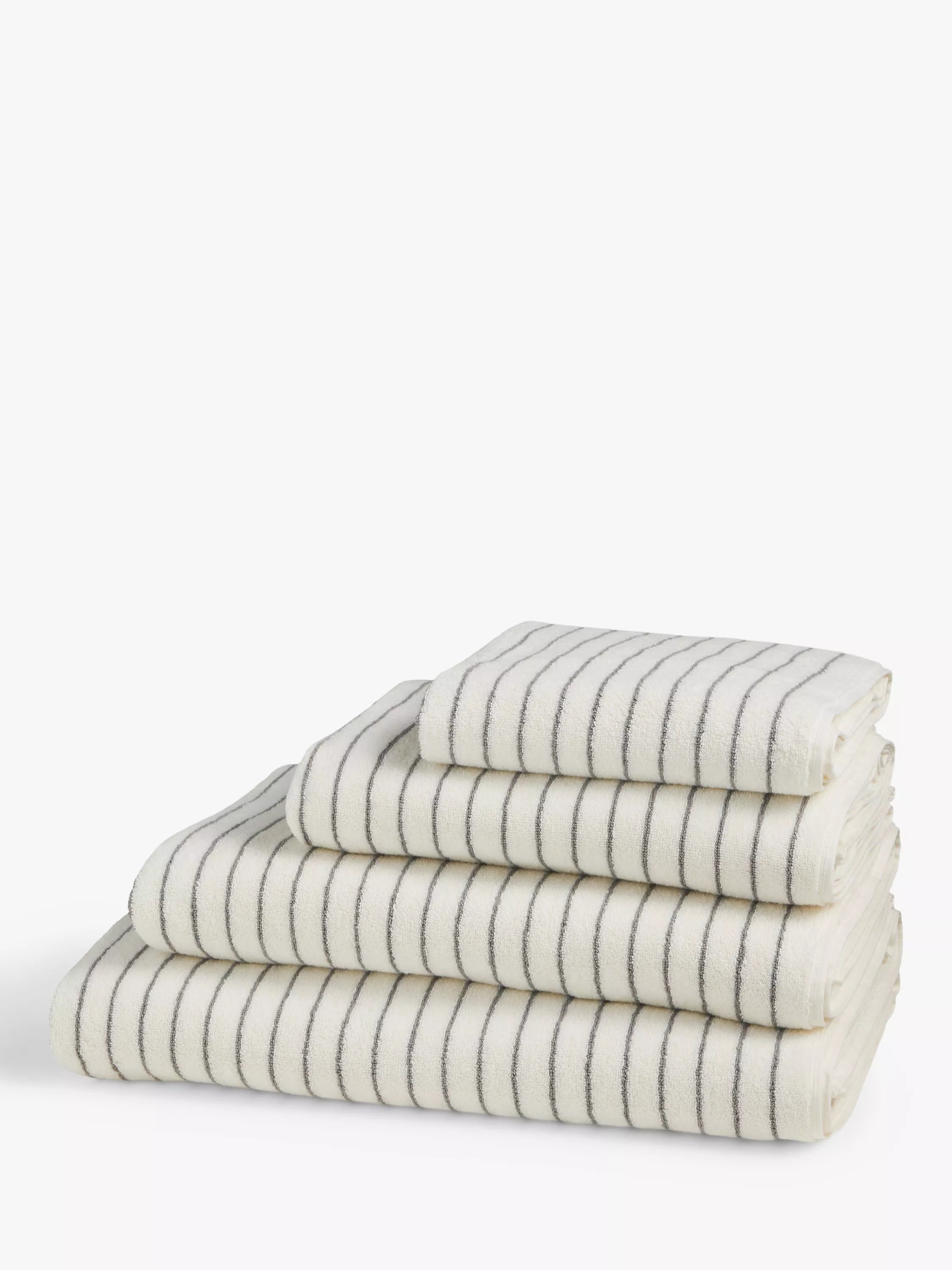 A natural ground with a soft, absorbent Egyptian cotton pile and fine stripe in three on-trend shades.