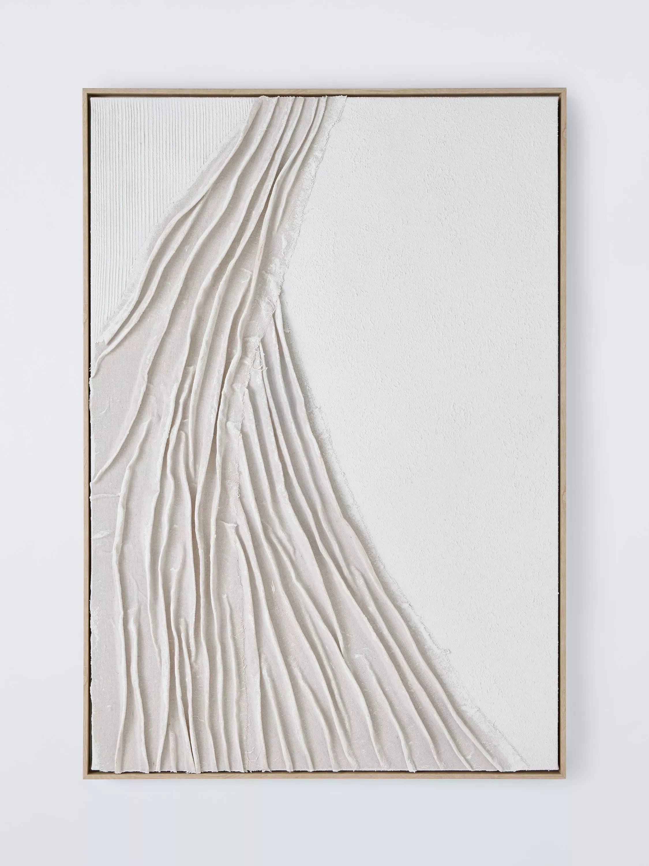 Hand-painted 3D abstract artwork in acrylic on canvas, using gauze material for texture. Presented in a wood-effect frame, ready to hang on your wall.