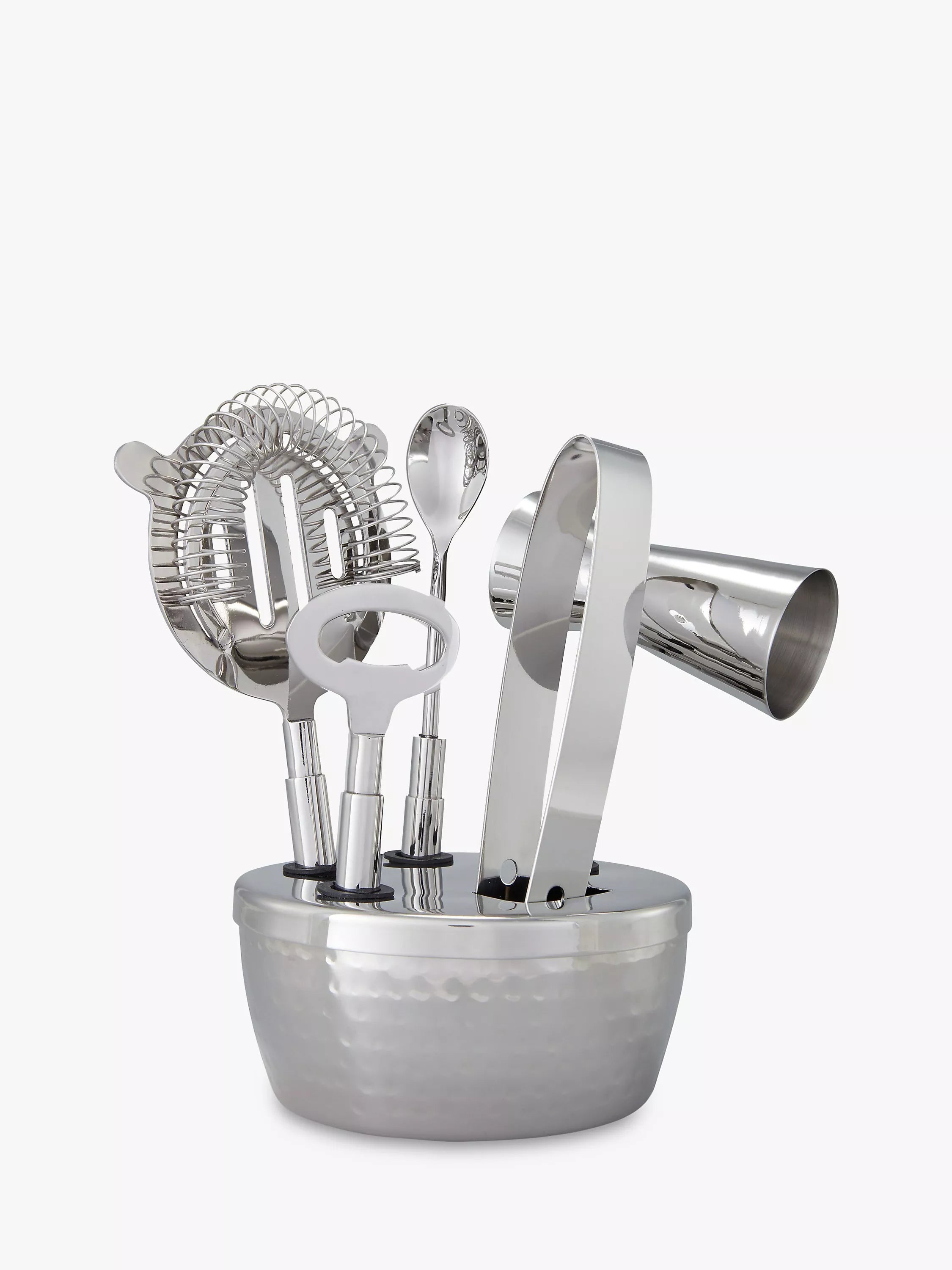 A classic barware set with just about everything you need to fix cocktails and drinks at home. Designed with mirror-finished heads, this stainless steel set is dishwasher safe for easy cleaning. Stored in a hammered stainless steel holder, the set includes measuring jiggers, a bottle opener, a mixing bar spoon, a strainer and ice tongs.