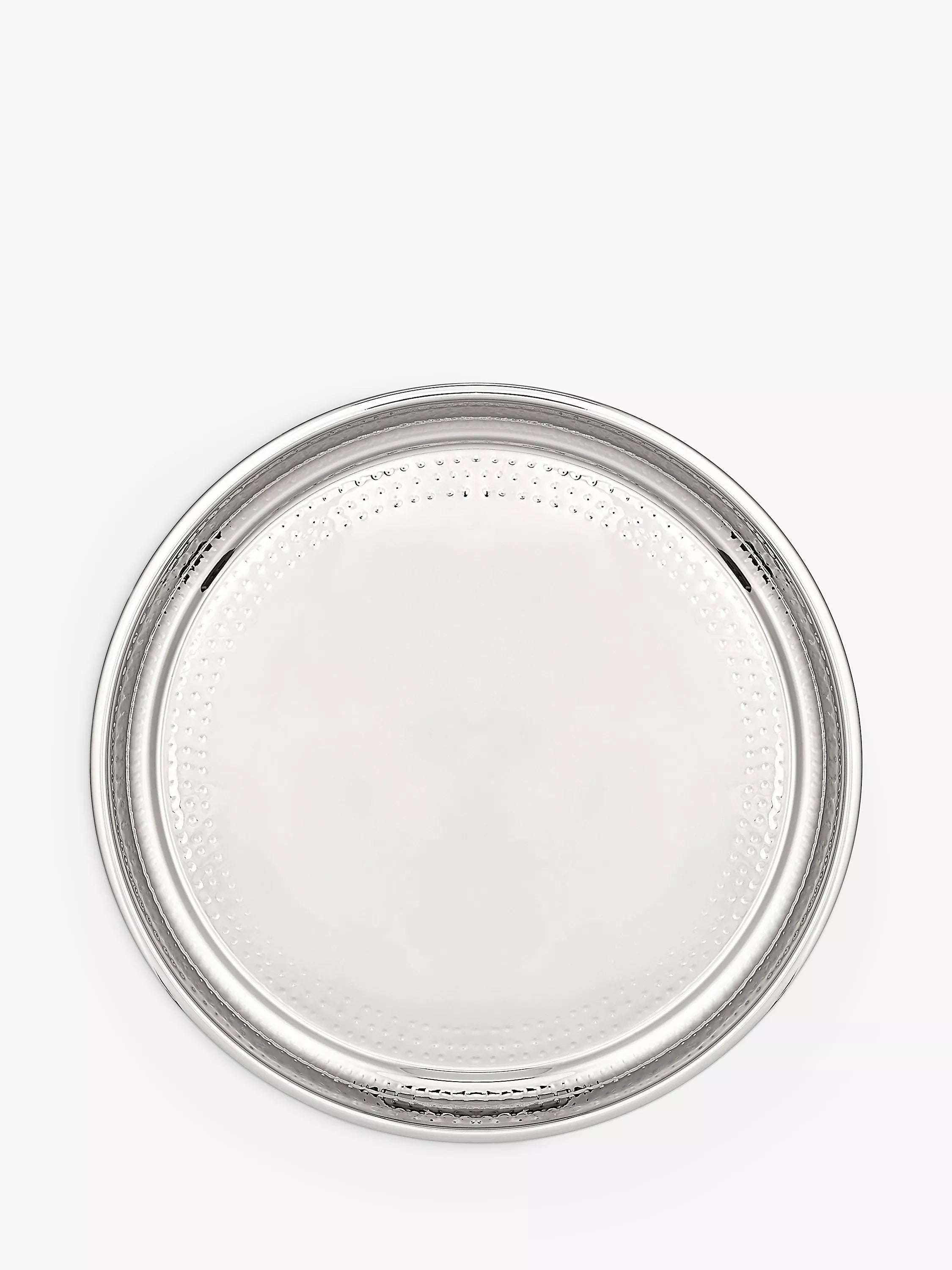 Serve drinks and snacks in style with this tray designed with a hammered metal texture. Made from stainless steel, it's durable and easy to wipe clean. This piece matches our range of hammered stainless steel barware.