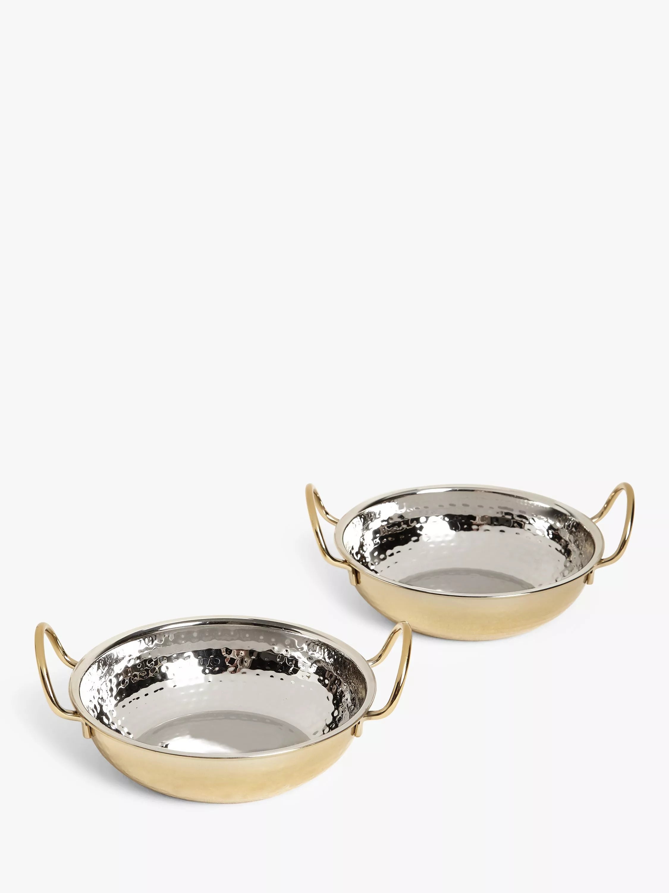 A pair of Kainoosh Balti Serving Dishes made from hammered stainless steel with a gold finish. The large side handles make it easy to move the dishes to and around the dining table.