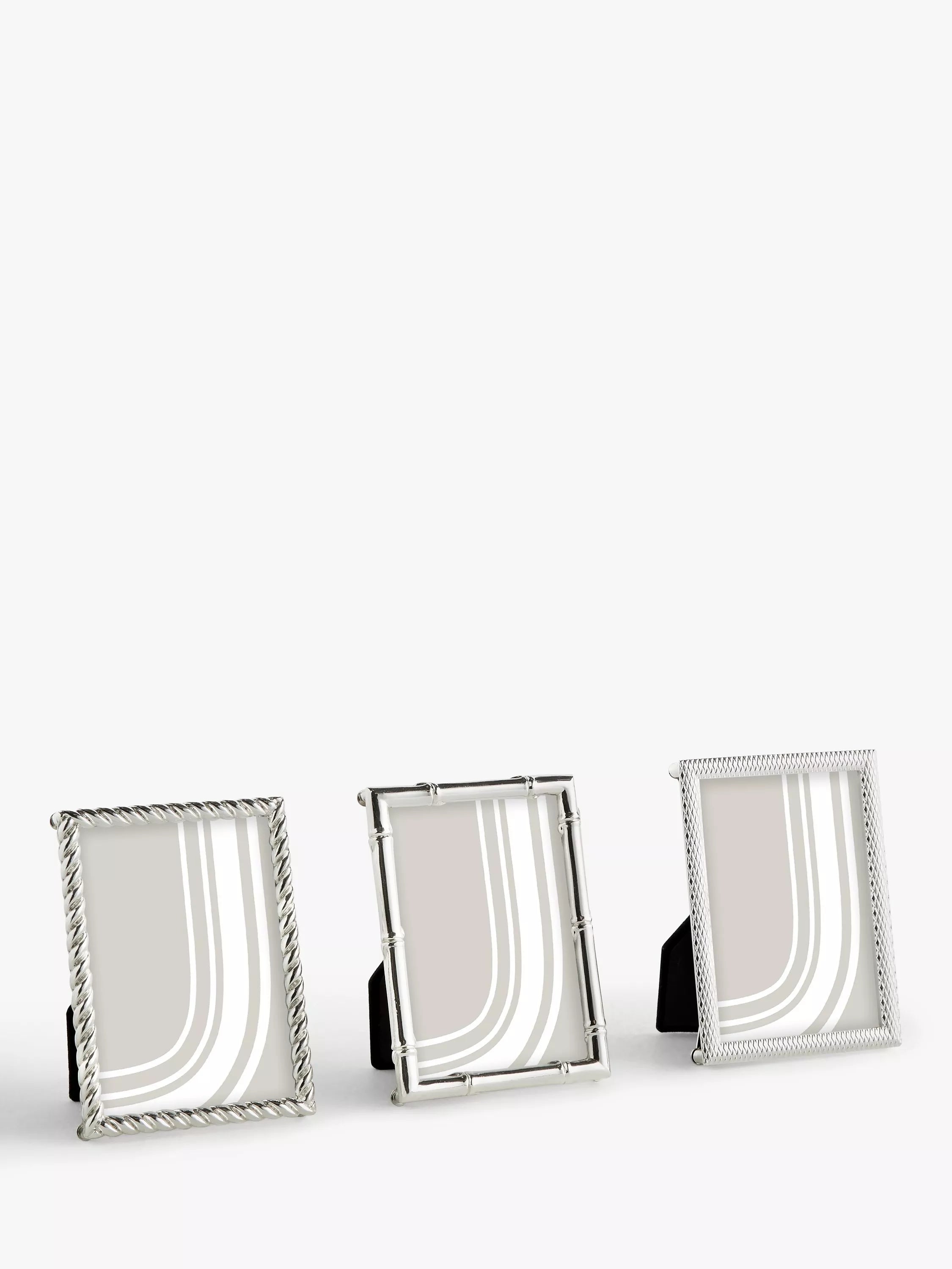 A set of mini photo frames in three assorted silver designs that perfectly complement each other. Each frame can be displayed vertically or horizontally. This set comes gift boxed, making a thoughtful present for weddings, anniversaries and other occasions.