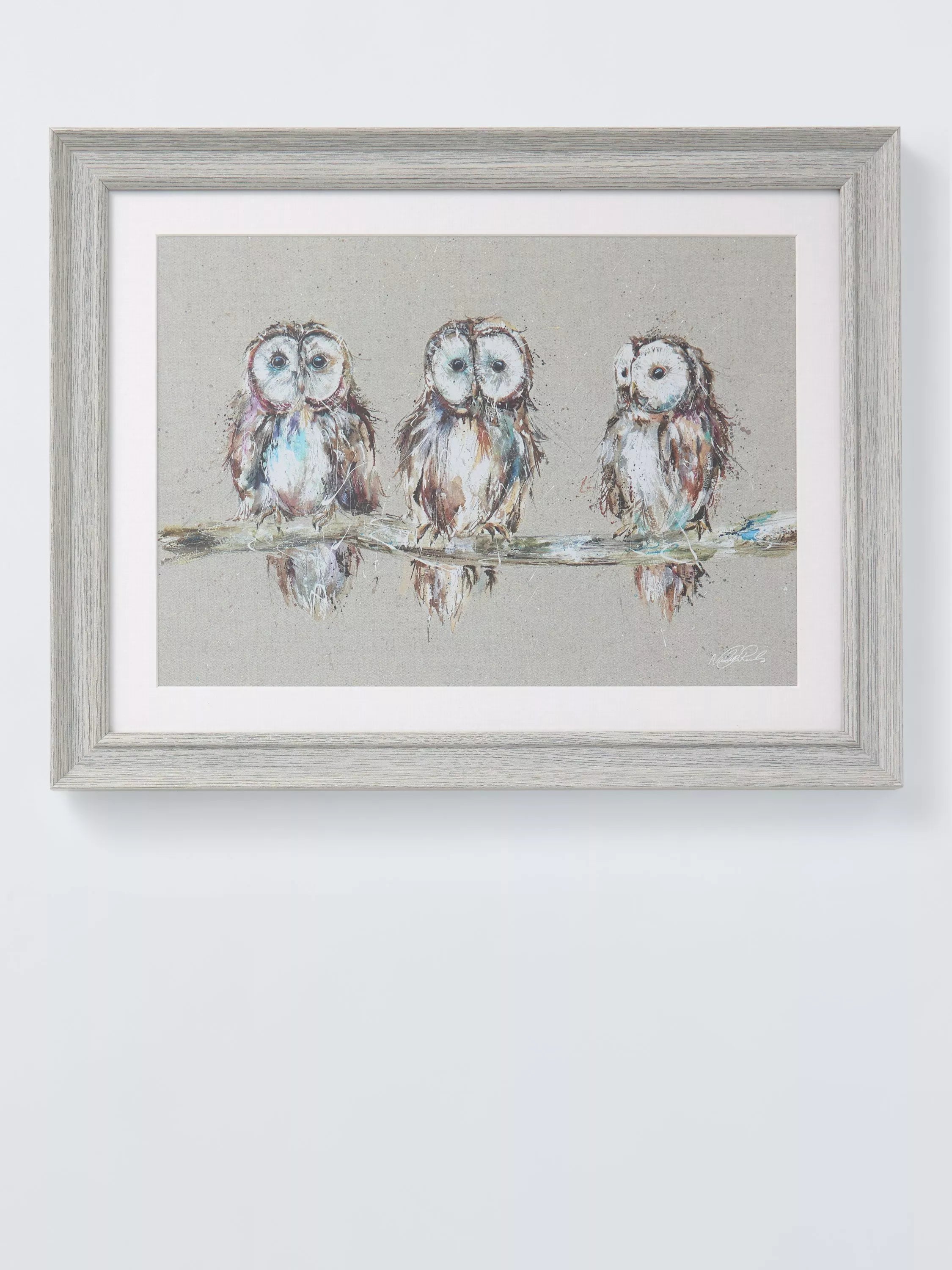'Owls' artwork by artist Nicola Jane Rowles. Made in the UK, this glazed print is presented with a window mount in a grey wood-effect frame, ready to hang on your wall.