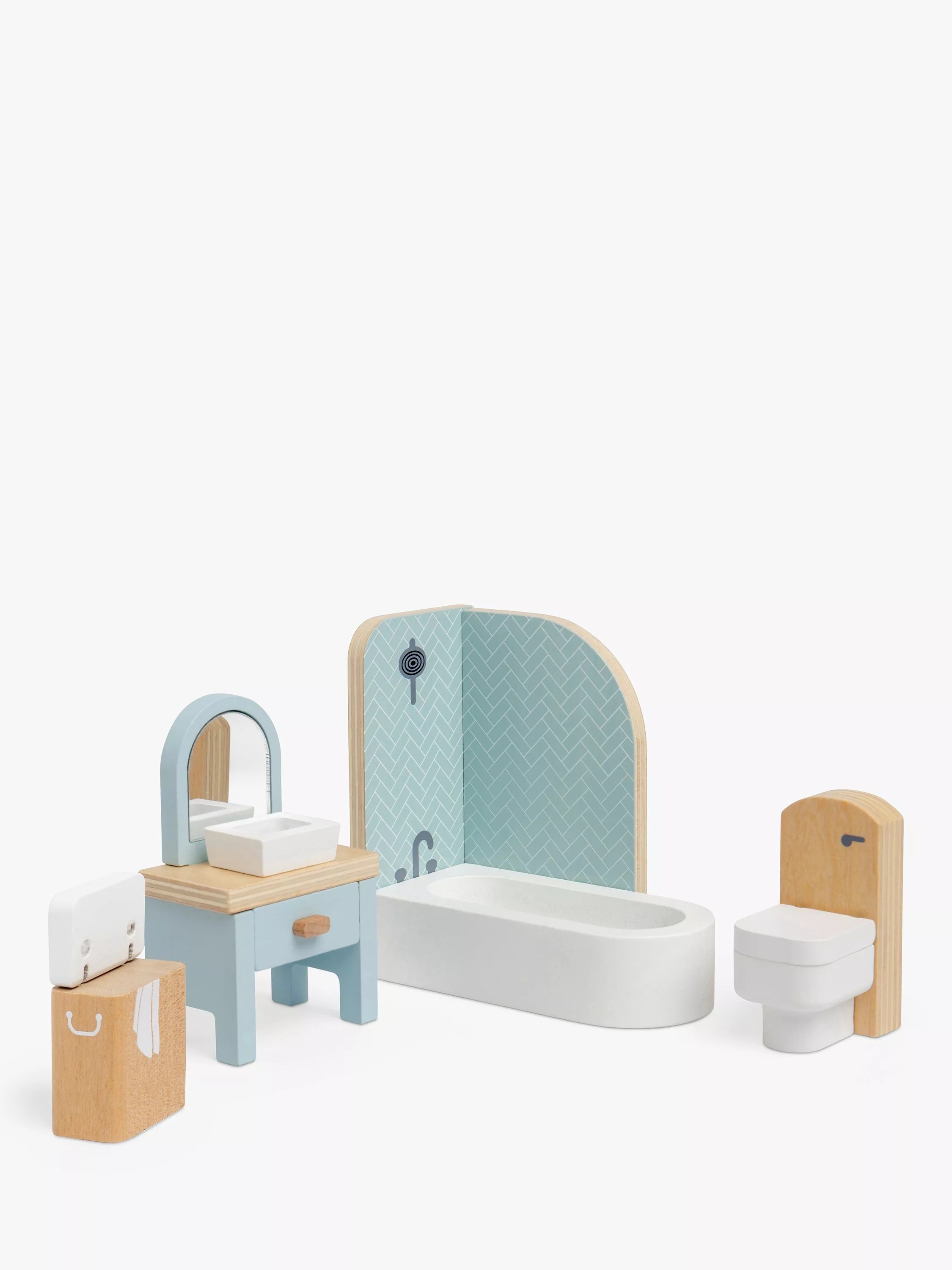This five-piece set features lifelike detailing, such as brick wall tiles.Styled with lots of natural wood and shades of pale blue, it comes with everything your miniature family will need. Items included are a bathtub and shower, loo, sink unit with a mirror and a washing basket.