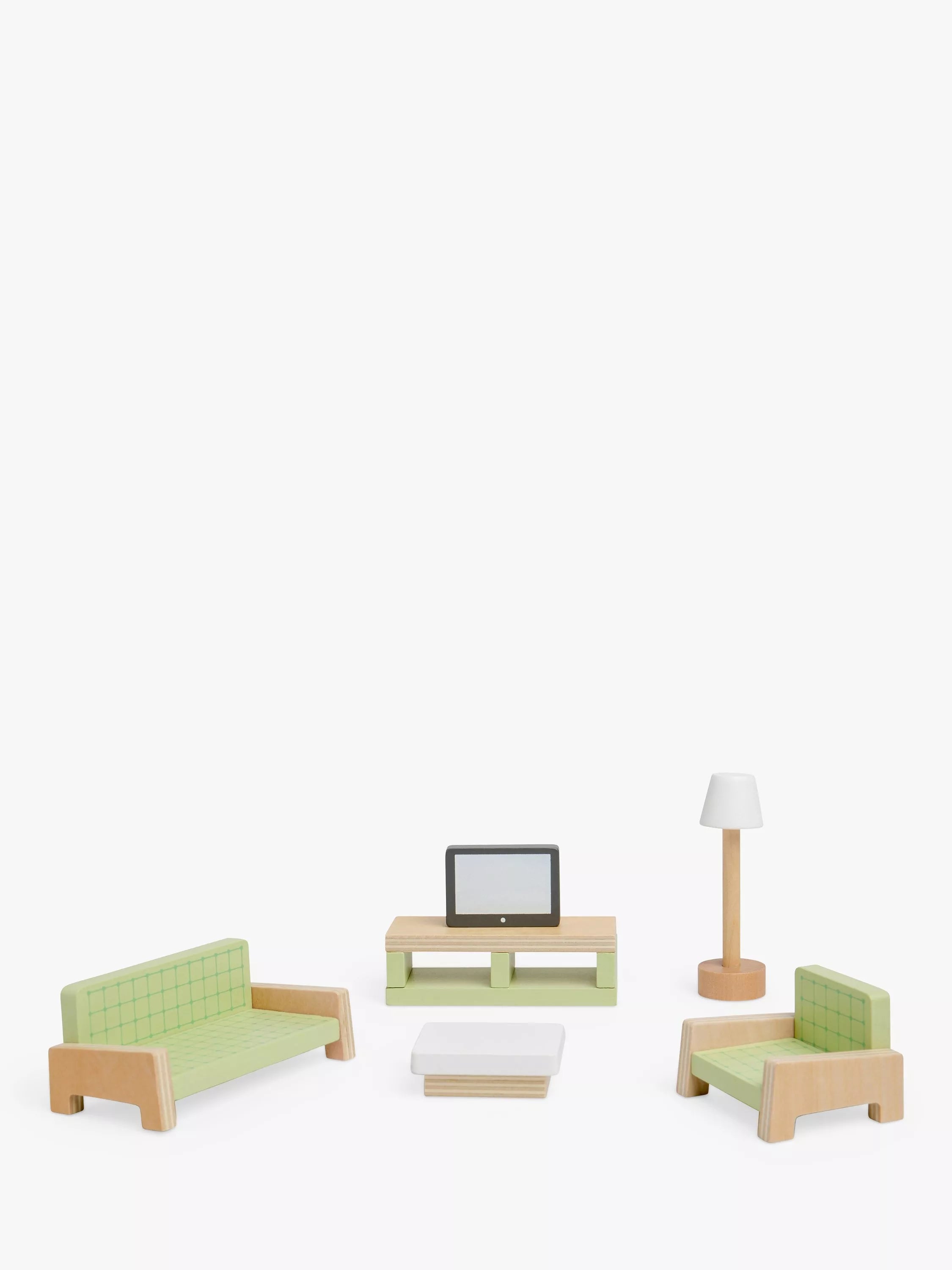 The five-piece set comes with an armchair, a two-seater sofa, coffee table, floor lamp, TV and stand, decorated in shades of mint green and white. Painted in sage green, this set will look stunning in your little house.