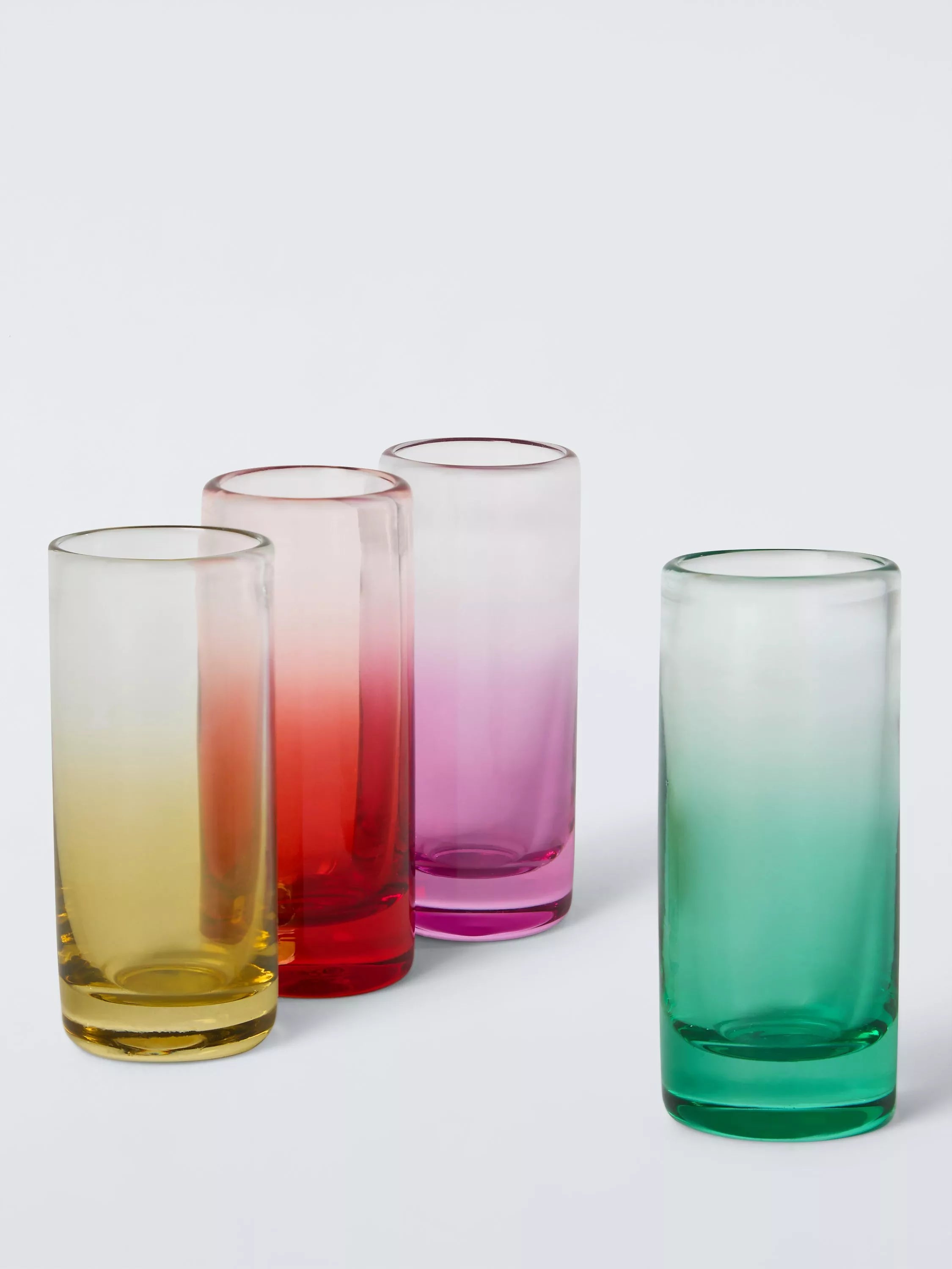 Four shot glasses in different colour ombre patterns.