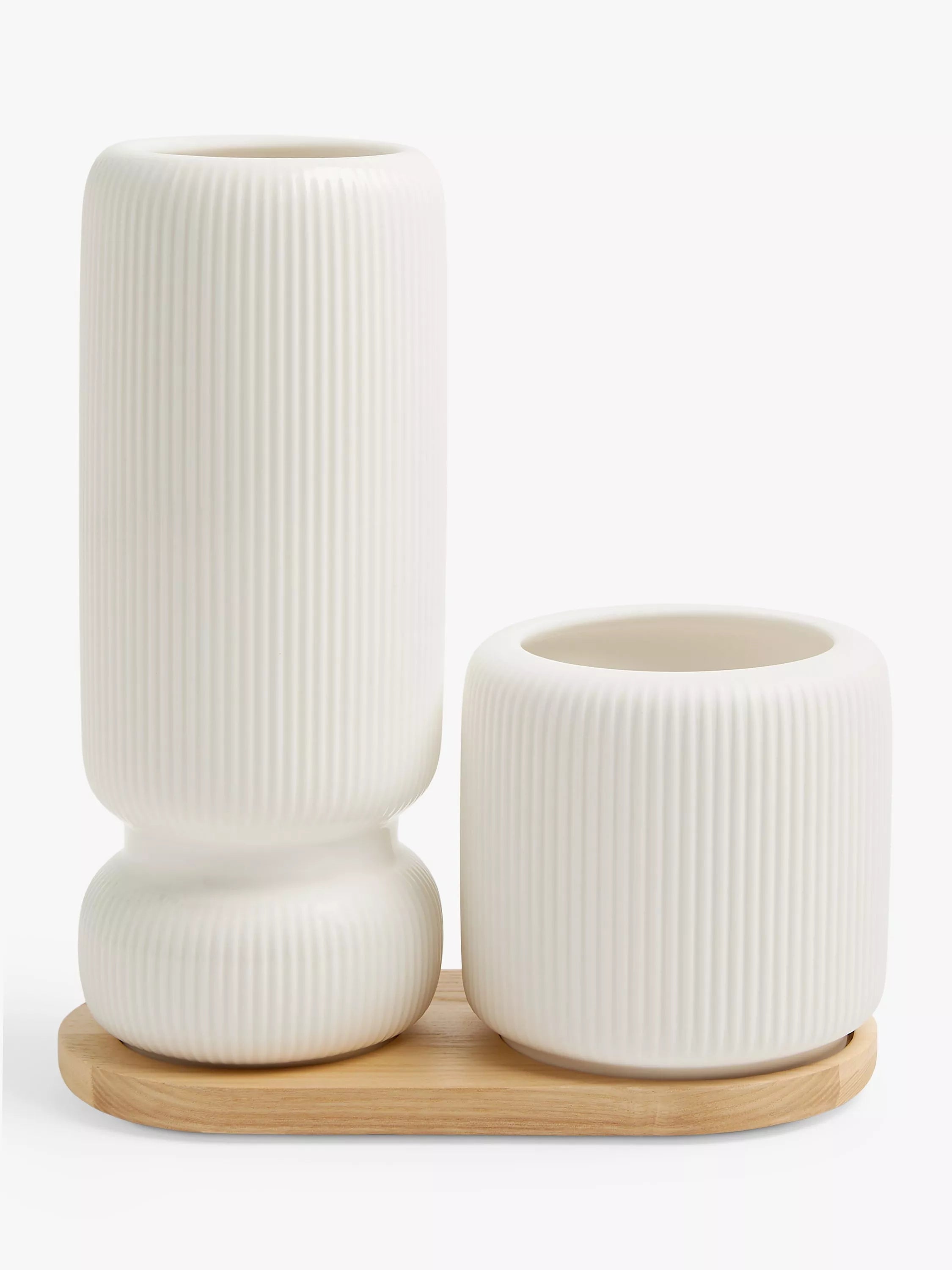 An eye-catching, dual vase set made from new bone china in a ribbed design. Sitting on a natural wood board.