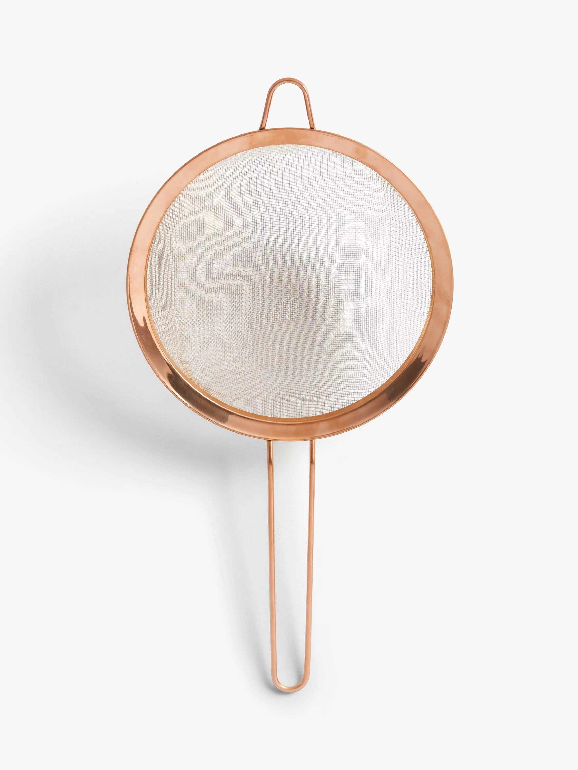 An 18cm sieve with copper-colour finish to brighten up your kitchen. Made of stainless steel with a durable double mesh for straining and sifting. Rest the smaller handle over a pan to keep the sieve stable.