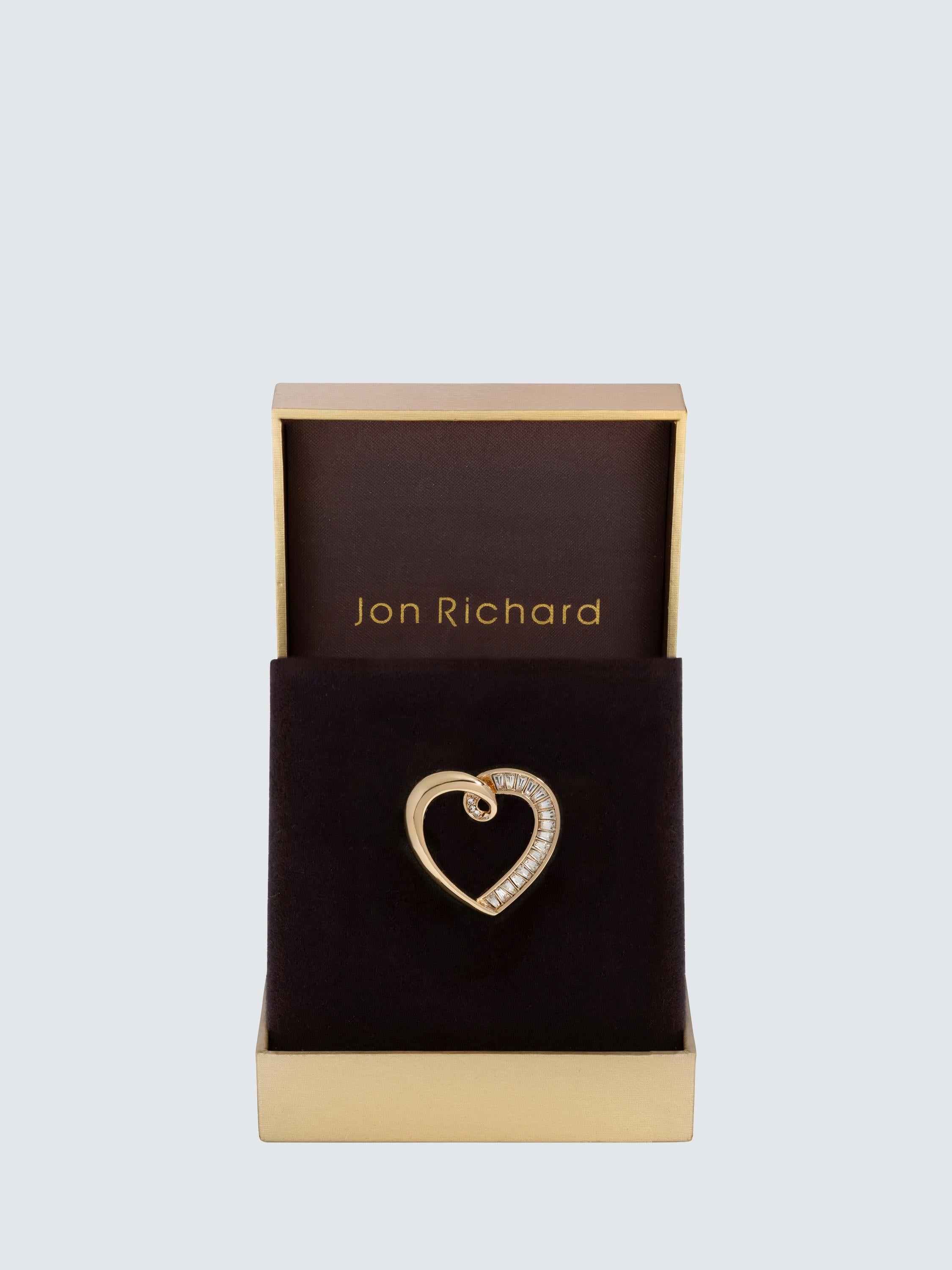This Jon Richard crystal heart brooch features rich gold plating, giving it a classic and luxurious aesthetic appeal. Designed to attach securely to any fabric using a robust pin mechanism, this accessory is highly versatile indeed. It provides an immediate point of subtle visual interest for your clothing.