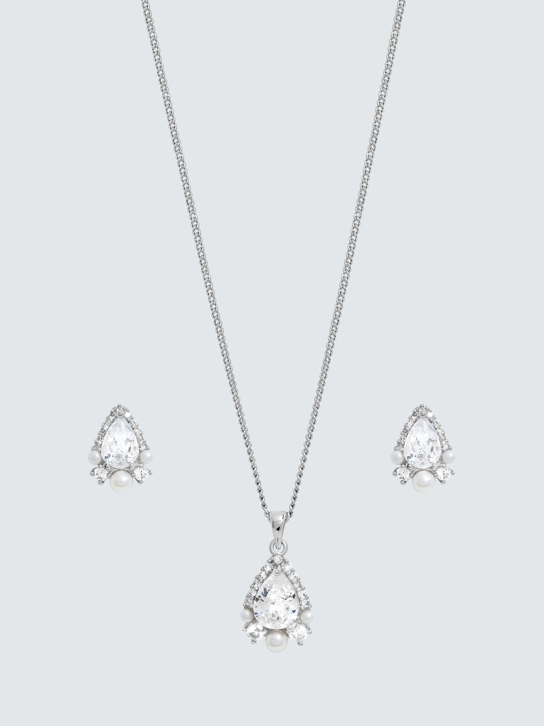 This Jon Richard cubic zirconia pear drop and pearl box set combines timeless beauty with modern sparkle. Featuring pear-shaped cubic zirconia and lustrous pearls, this set includes a necklace and matching earrings, all crafted with a sleek rhodium-Plated finish. In a lovely gift box this makes a perfect gift for someone special or yourself.