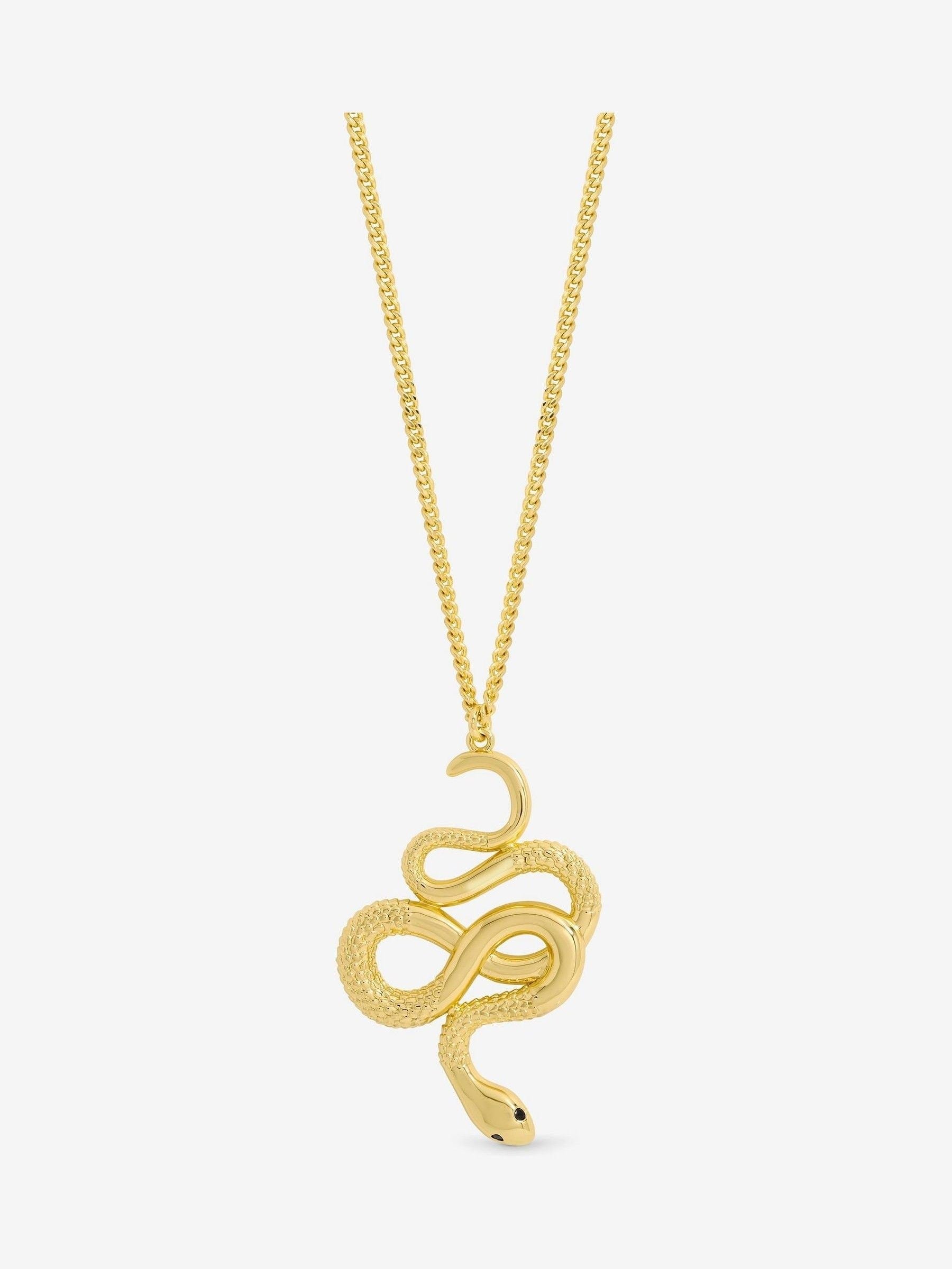Our Gold Plated Snake Long Pendant features a striking design that brings a sleek edge to any look. Crafted in a radiant gold-tone finish, this elongated necklace features a gracefully curved snake, an ancient symbol of transformation and strength. Fastening: lobster clasp. Width Dimension: 35mm. Length Dimension: 55mm. Chain Length: 31.5'. Material: Gold Plated Base Metal.