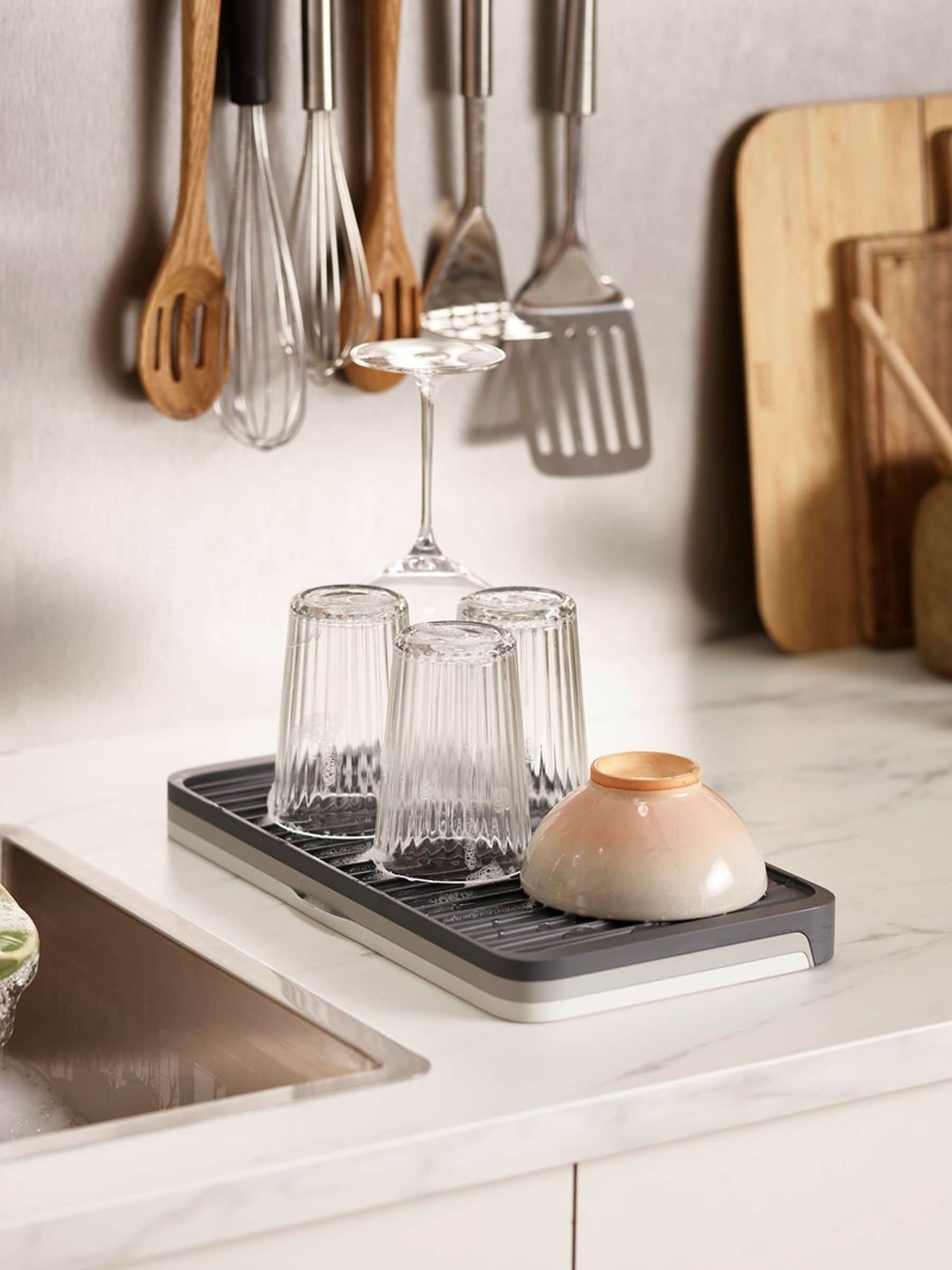This handy draining board can be extended to over twice its size to provide a high-capacity draining space wherever you need it. Simply place on a flat surface and pull each end to expand. Each tier features a wide platform for a variety of washing up and raised ribs to prevent water being trapped inside cups and glasses. To drain, simply push the tiers together again, lift and pour the excess water away via the handy spout. Its compact size when collapsed means itâ s perfect for storing under the sink or inside a cupboard. Wash and dry by hand.
