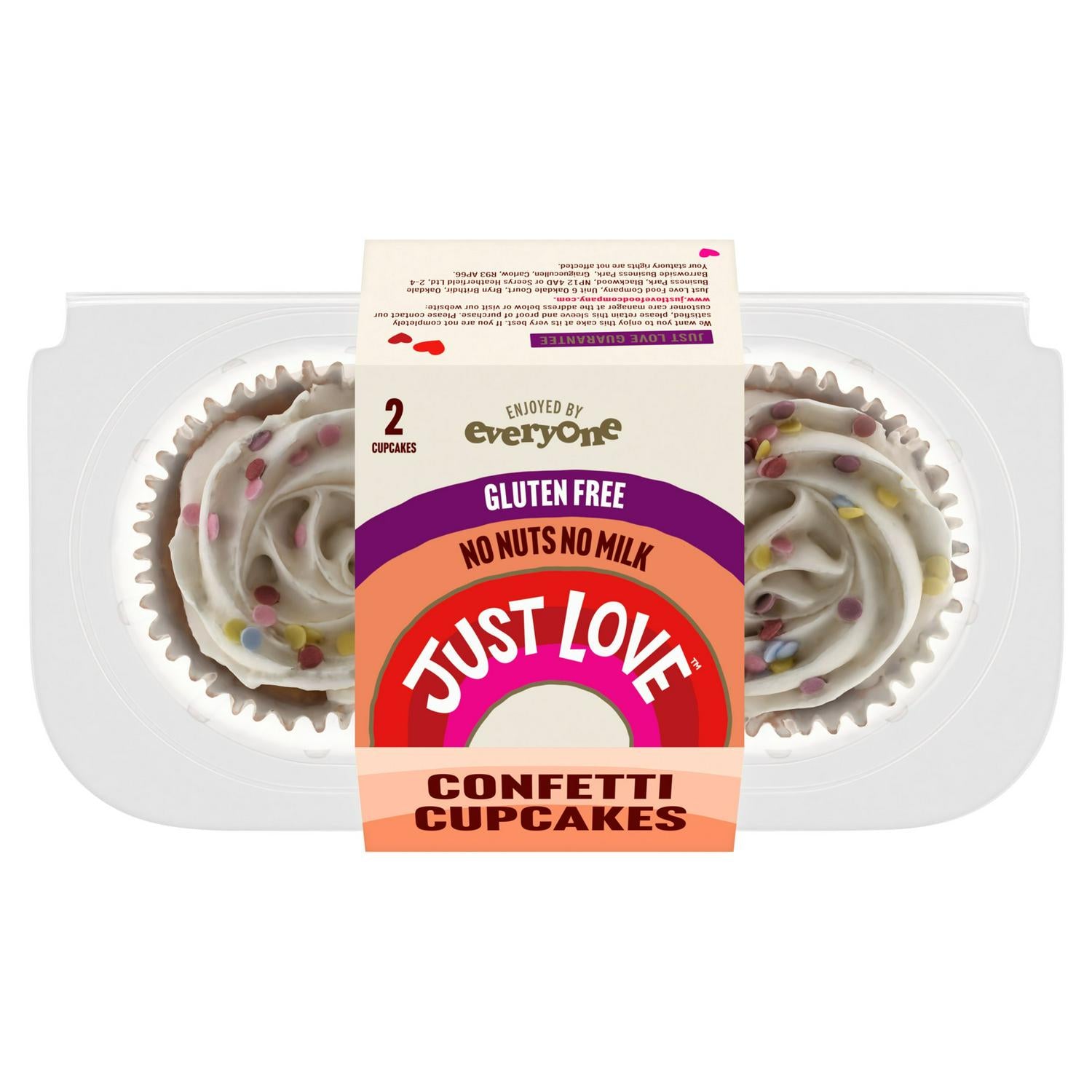 These Just Love Confetti Cupcakes offer a delicious vanilla sponge treat, perfect for those with dietary requirements. Each pack contains two cakes topped with vanilla flavoured frosting and colourful edible confetti decorations. They provide enjoyable, inclusive options for sharing at any event.